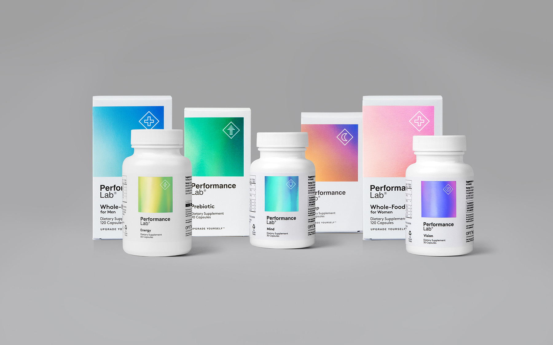 Robot Food elevates Performance Lab’s line of vitamins by adding vivid, almost holographic-esque designs to each bottle and box.