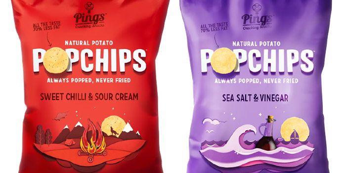 “Our first job was to create the Popchips sub-brand, which consisted of four variants: Sea Salt, Salt & Pepper, Salt & Vinegar and Sweet Chilli & Sour Cream. At this stage of the design Ping’s wanted to avoid the clichés of traditional chip packaging in order to achieve cut-through so we were fine by that!