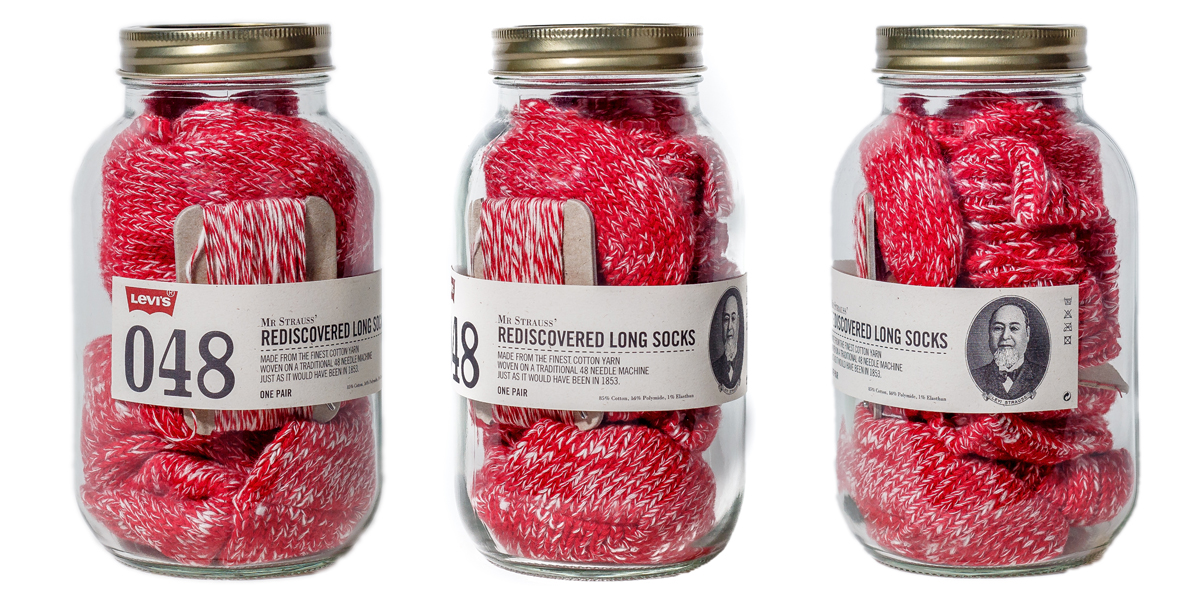 MAD Projects Industries has stripped down Levi’s Basics to a bare minimum. Undergarments are packaged multi-functionally with a universal substrate of wood. The boxer Brief is pouched in kraft paper, slipped into a cardboard box and embellished with a polka-dotted match-strike. The “Truck” is stored in a tray box, printed with wood grain and finished with the garment logo. Finally, rediscovered Long Socks of Mr. Strauss are “hipsterified” and tucked inside a mason jar with a bonus needle and thread.