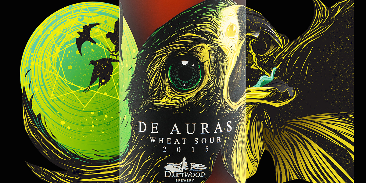 The hypnotizing label for De Auras Wheat Sour designed by Hired Guns Creative is sure to excite any craft beer enthusiast. Against the amber bottle, blacks, greens, and yellows create a mysterious and enticing effect. Look into the eye of the falcon and it’s easy to get lost in the hidden designs that are identical to the ones you can also find in the light of the moon on the back. The label feels edgy, almost dangerous and unpredictable to those who want to venture away from the typical beer choices. De Auras is illustrated with attention to detail, allowing consumers to explore it and discover new things about it, just as they will with the different notes of the wheat sour beer.