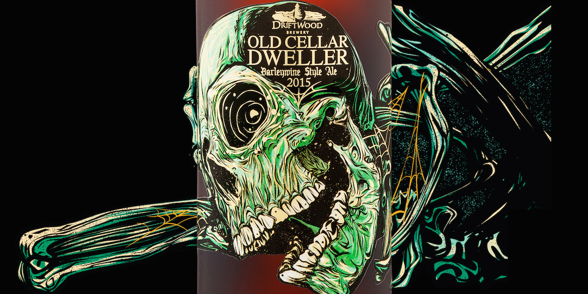 “For Driftwood Brewery’s Old Cellar Dweller barleywine, our task was to design a label that showcases the strong character of the beer, while speaking to its aging potential. To these ends, we chose to illustrate our take on a grinning skull, favoring a bold, graphic approach. The dieline protrudes with ribs, teeth, and the long outjutting arm bones that create an excess of negative space, at once playful and decadent. Wax dip and gold foil lend the final touches and the spark of life to our skeleton in wait.”