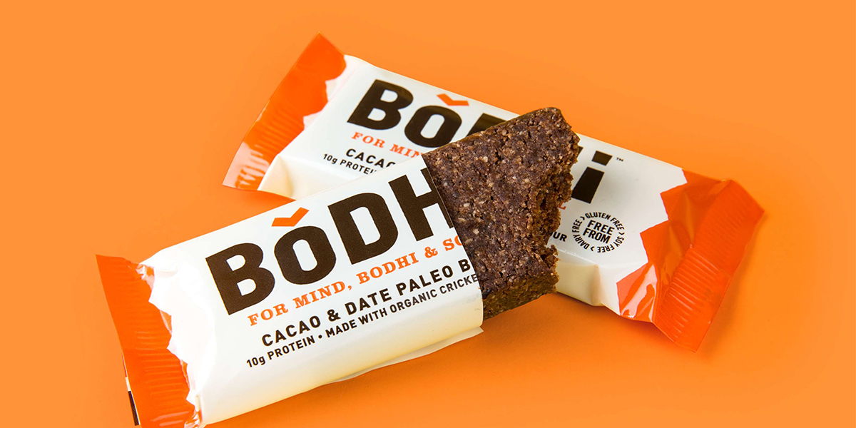 BODHI make paleo and protein bars with an unusual ingredient. Cricket flour. So Robot Food gave them a brand identity and packaging worth chirping about.