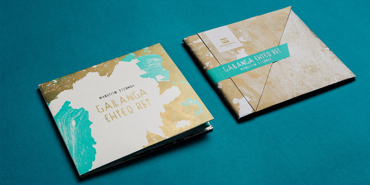 “The design of the CD reflects the strength and the struggle of a black Brazilian hero. The graphic design developed portrays the life of Galanga Chico Rei: his slavery, his fight for freedom and the construction of his reign. The biography has water as a striking element and the design of the cd, using the graphics represent: the sea that separates the hero of its land and the waters where the slave ship sailed until arriving in Brazil; the sweat from the skin in the mines of gold exploration; the water used as camp technique by using ‘bateias,’ the Galanga’s path to freedom.”