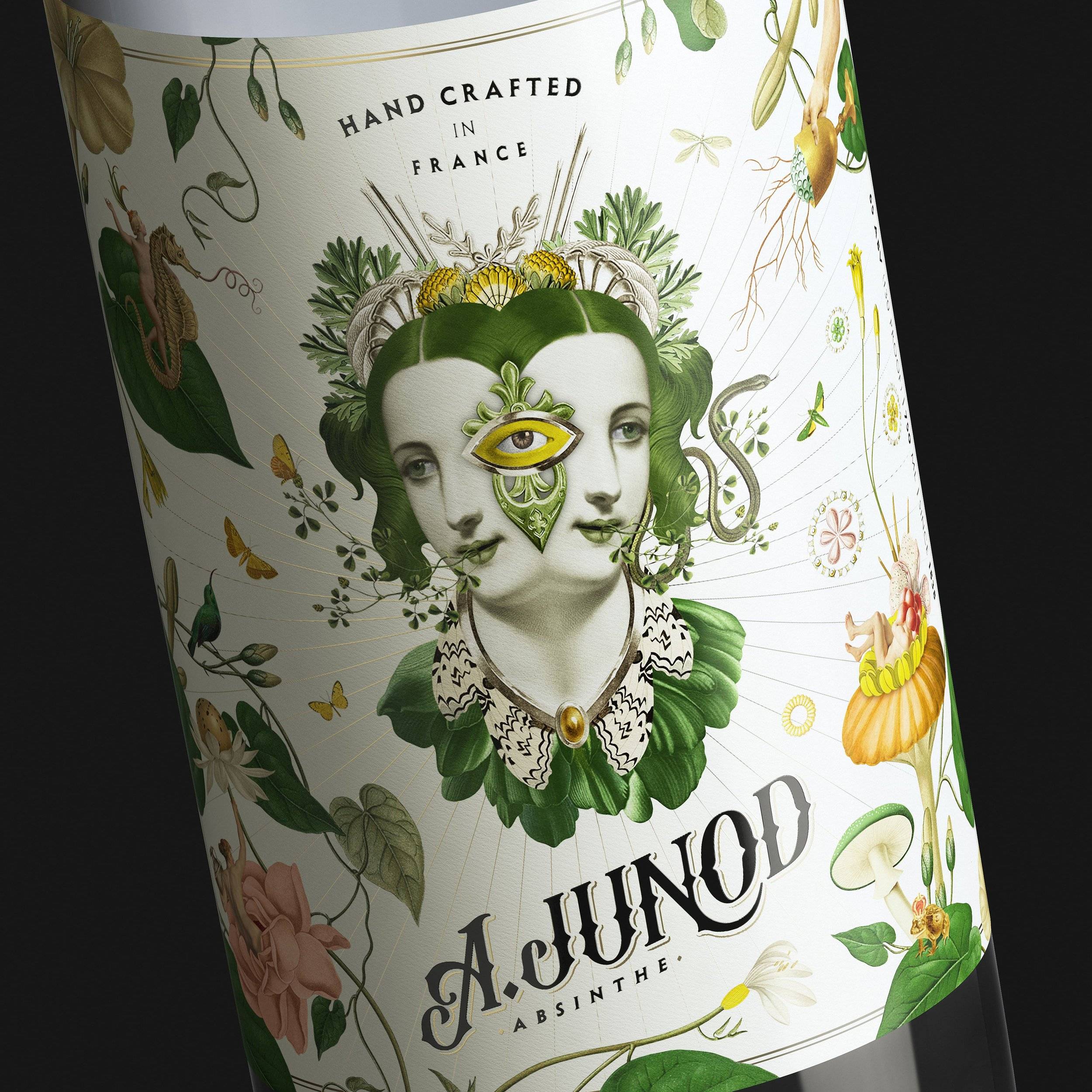 “I was commissioned to update the brand structure through a new design for the label and packaging. A full illustrated label was created to give a new and refreshing face to A. Junod. I drew upon the richness of absinthe’s history, as well as its mystical and even supernatural qualities that so much inspired the bohemian culture of its time.