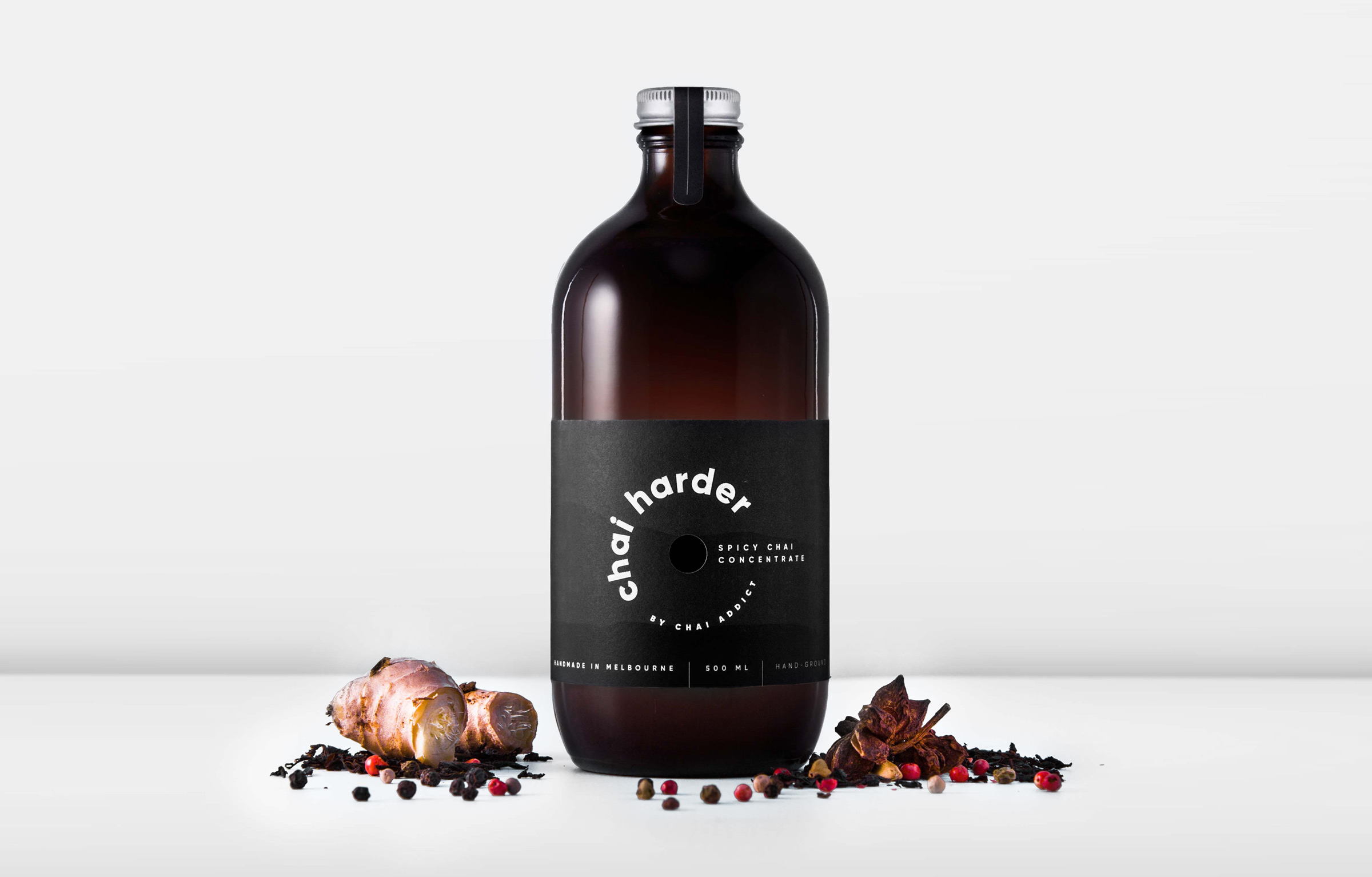 “Chai Addict is a masala chai tea concentrate handmade in Melbourne, with an emphasis on flavour, consistency and sustainability. To embody the brand’s purity, we developed an minimal and elegant package on Boston bottles with a black and white colour palette, enhanced by a die cut circle and a raised spot varnish.”