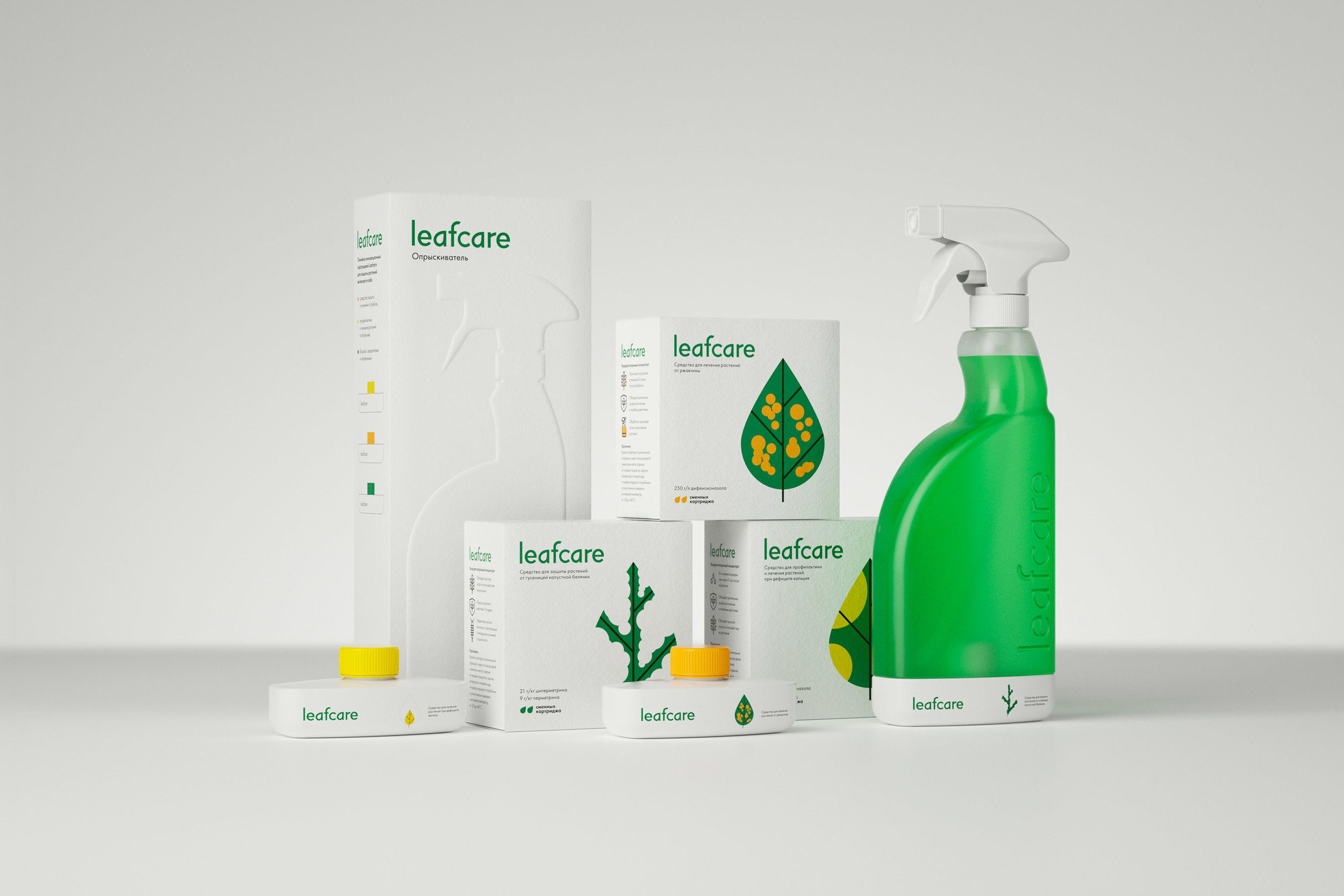 Alexandra Loginevskaya designed the packaging for Leafcare, a conceptual brand that aims to help gardeners treat and identify plants with diseases and issues. The design features flat graphic images to help identify the purpose of each various product, making it easy on consumers to find what they’re looking for specifically.