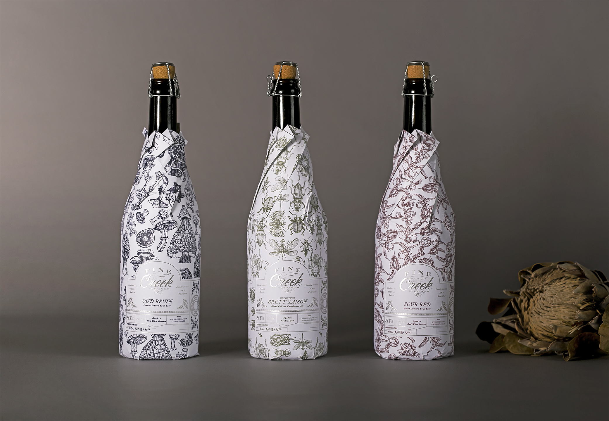 To the Fourth created this eye-catching packaging for Fine Creek Brewing Co., a Virginia-based brewery that comes with a high-end feeling. The illustrations on the wraps for the bottles fit a traditional style and are reminiscent of scientific illustrations of flora and fauna, providing an elegant feeling overall.