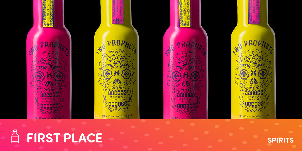 he concept was a hybrid of polar worlds where the dead meet the living. A homage to the Mexican holiday Dia De Los Muertos (Day of the Dead), was merged with the American tradition of Moonshine crafting. Two varieties of Mezcal Liquor, AƱejo and Dorado, represent legendary twin warriors reincarnated as the sun and the moon. Presented together as a pair of bottles with respective shot glasses, this project demonstrates that it is possible to design sustainable packaging for multiple units of breakable goods without sacrificing artistry. The target audience for Two Prophets are thrill-seekers and curious millennials.