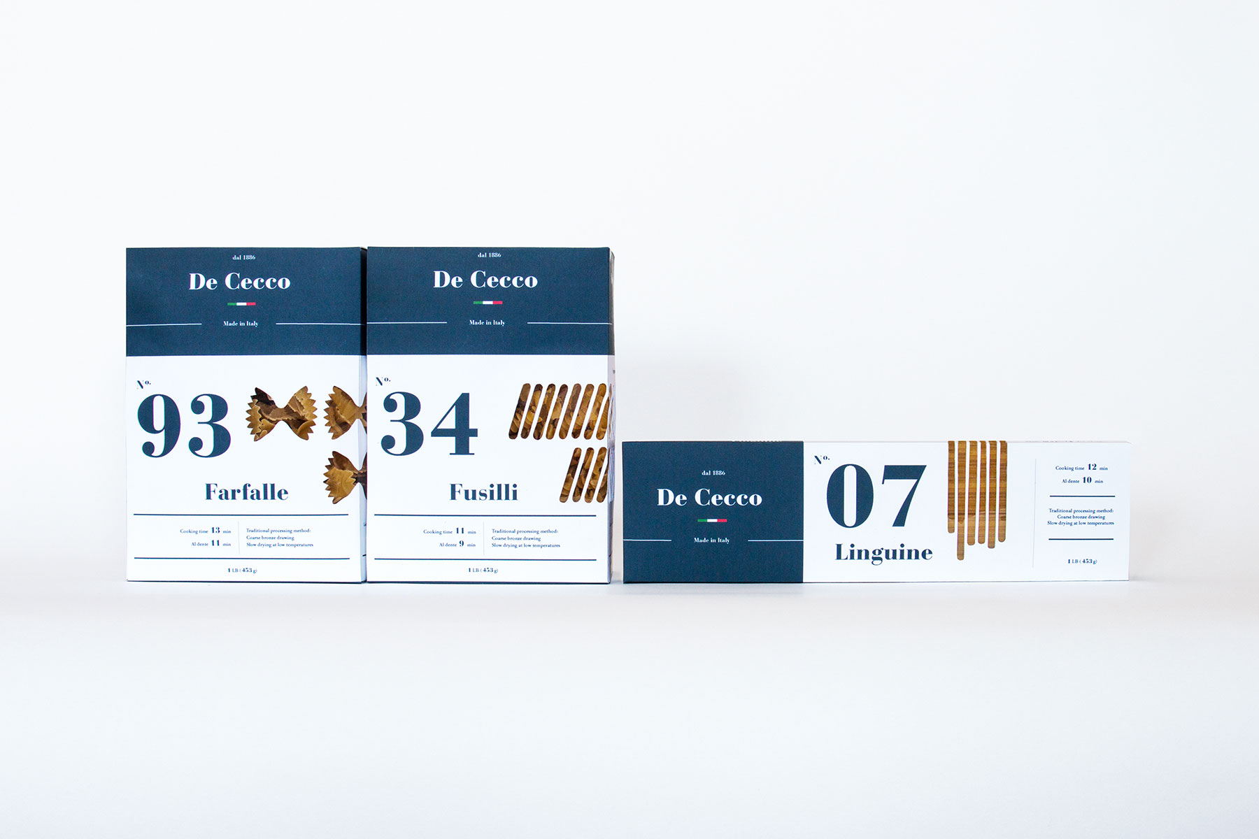 “Packaging and rebranding of Italian pasta brand De Cecco. Keeping it classic with an updated color palette, while adding some playfulness with big, elegant numbers and more interesting cut-outs inspired by the shape of the pasta in each box.”