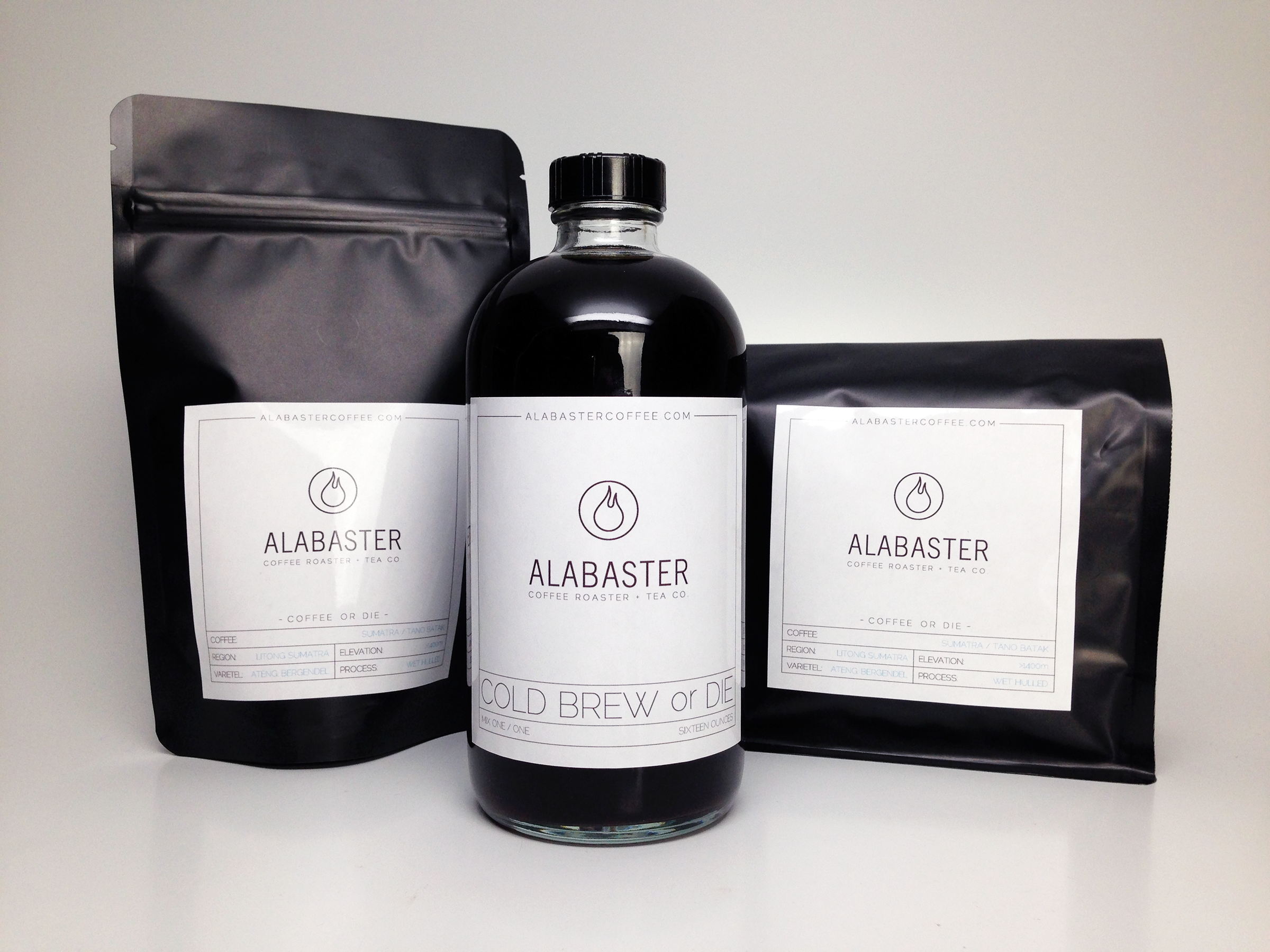 Upon their return home, the team at Alabaster realized they needed to better position themselves for national success so they reached out to designer Joshua Lepley. Joshua’s direction on the package redesign project was to guide the look & feel of the Alabaster brand back to their logo design which is very minimalist. The final packaging, including a 4oz sample bag, 12oz retail bag and their Cold Brew or Die bottles, is a minimalist chic cohesive package ready to stand along side the big dogs.”