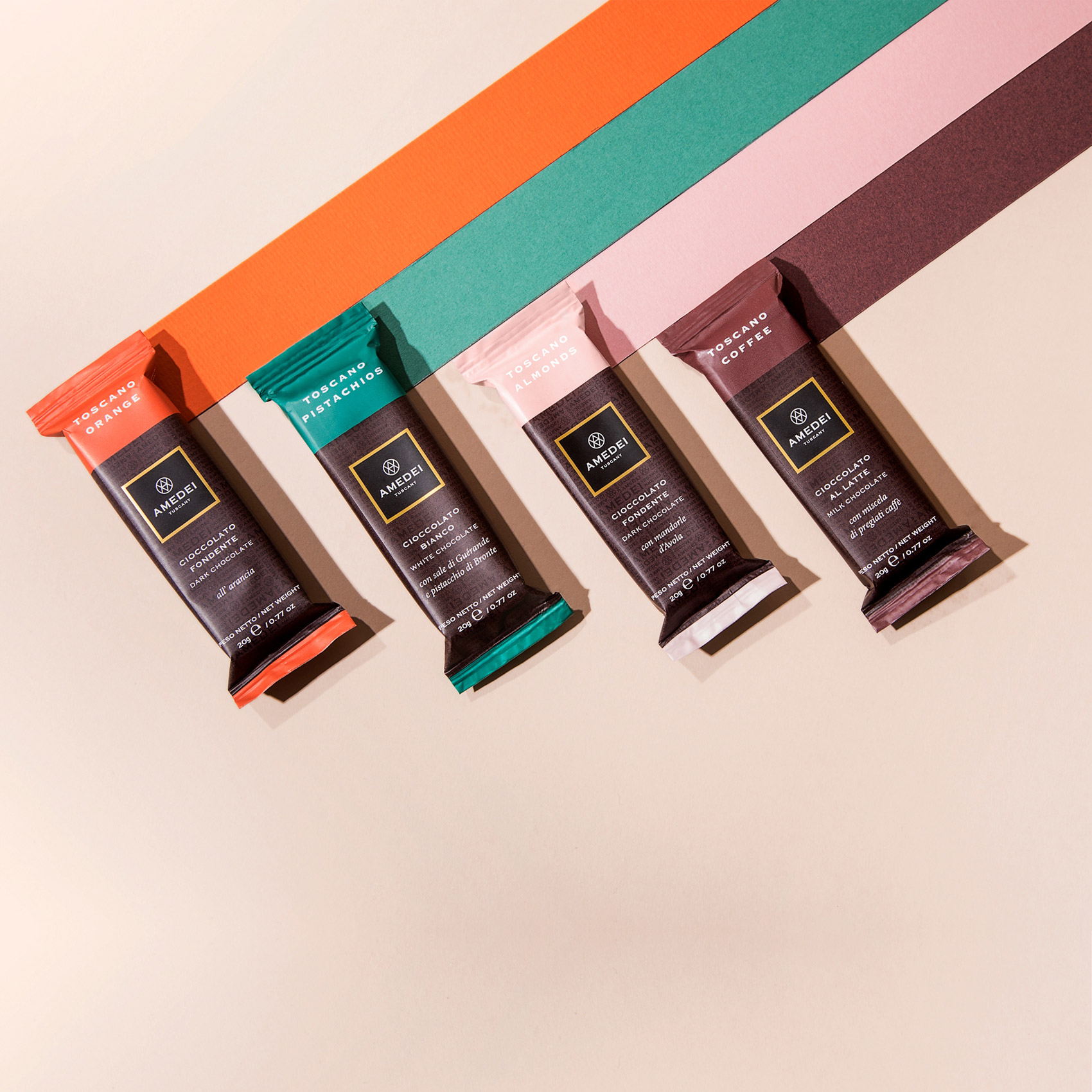 Drogheria Studio designed the packaging for the chocolate snacks produced by Amedei Tuscany. Amedei Tuscany manufactures artisanal and refined chocolate, known all over the world for its high quality. They promote a real chocolate culture using old techniques of chocolate processing.