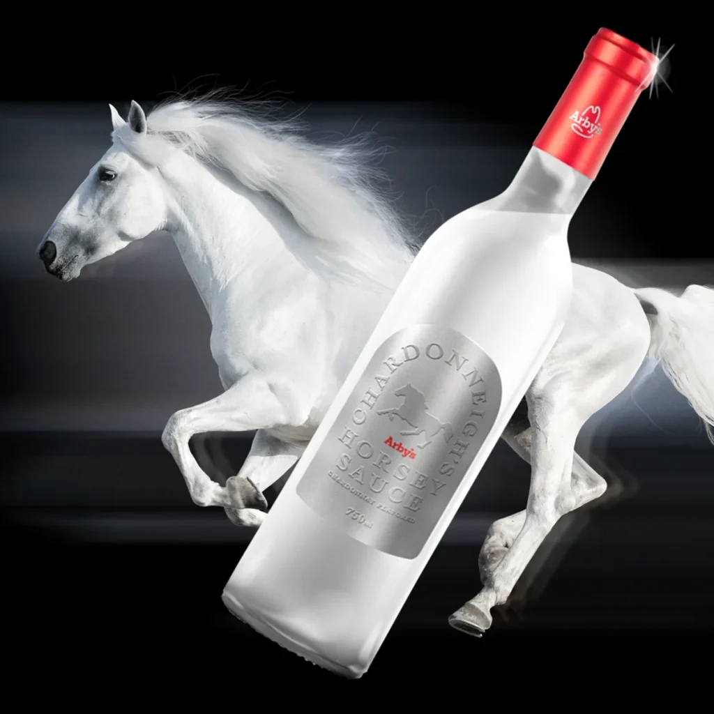 The latest version of Arby’s horseradish-based Horsey Sauce is packaged in a 750ml frosted wine bottle using a metallic label depicting a galloping Lipizzaner horse. The Arby’s logo provides a dash of color in the middle of the label and on the top of the bottle.