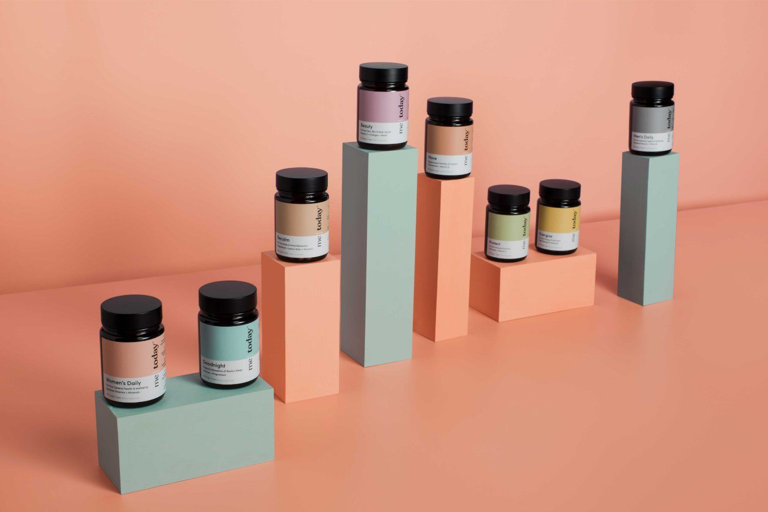 Wellness brand me|today breaks away from the traditional look and messaging of other health supplement brands through the use of soft colors, quality packaging materials and finely-tuned typography for a look that’s premium, comforting, and contemporary.