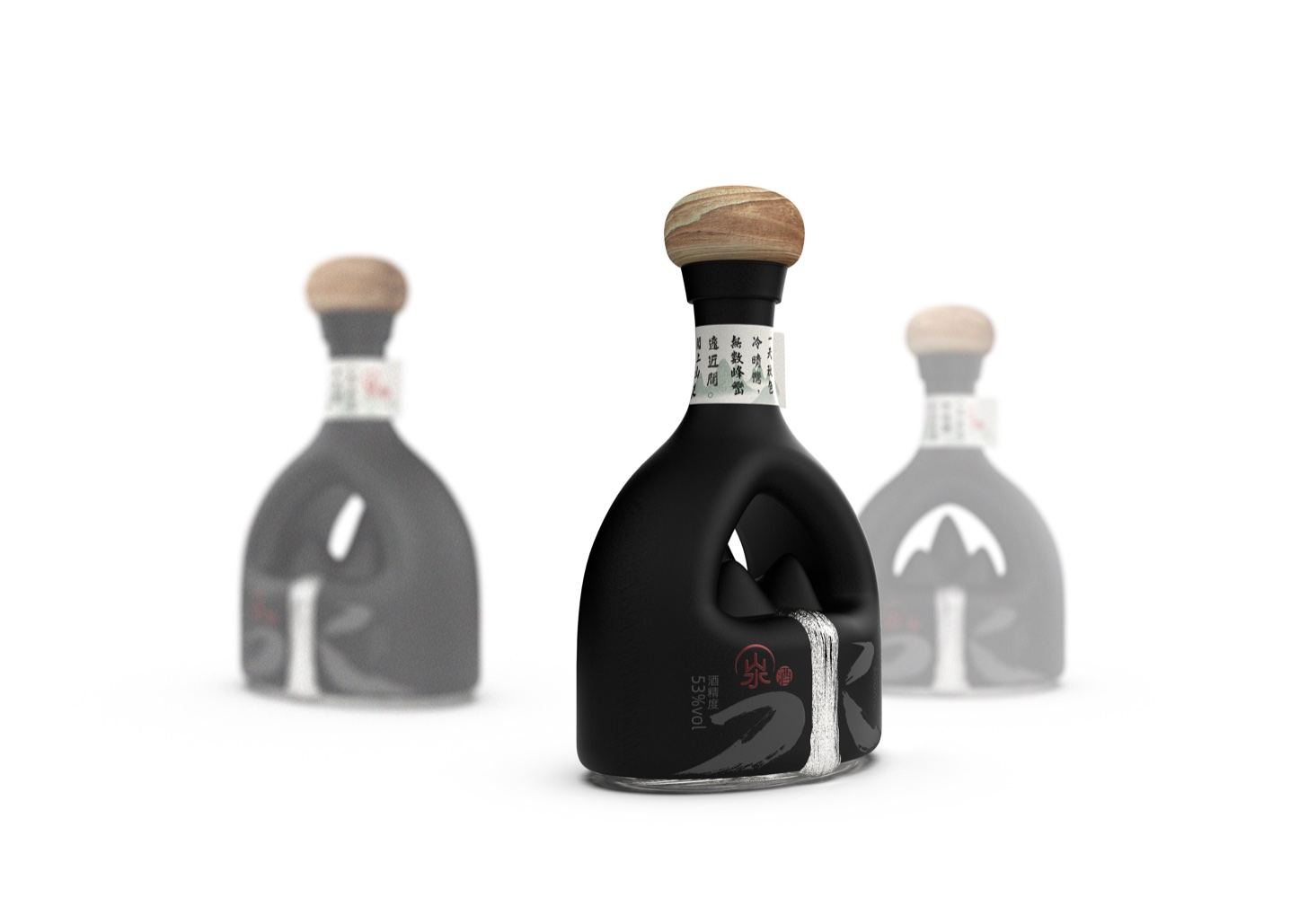 ?, pronounced “Pin”, is a simple yet uncommon Chinese character with mountain on top (?) and water below (?). “?” means “waterfall” but also refers to “a place with great mountain and good water quality”, which is the key the make outstanding aged Chinese Baijiu. This design transforms the Chinese character into a high-end Baijiu bottle in an intuitive but expressive way. The main visual style adapts the water-ink painting of traditional Chinese art, together with the space that is intentionally left blank to bring endless imagination.