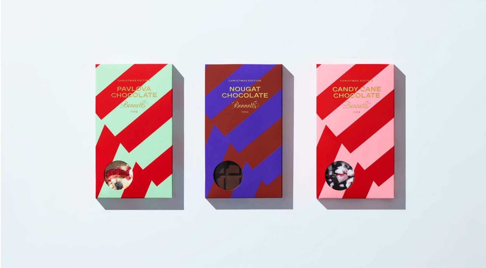As part of our ongoing collaboration with Bennetts, we developed the Christmas Edition; a range of specialty Christmas chocolates spanning bars, blocks, boxes, crackers, hangers and advent calendars. Our solution is a vibrant celebration of festivity and joy, inspired by gift wrapping and the timeless modernity of stripes.