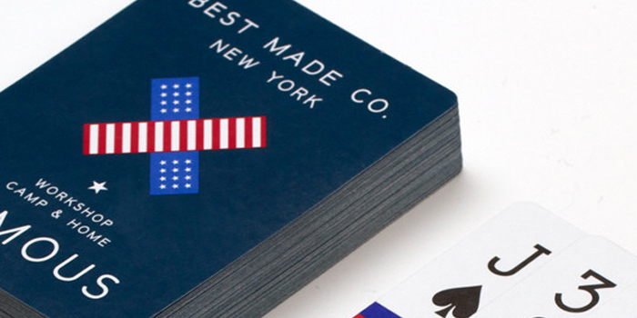 “These Playing Cards Designed by Best Made in New York, printed in Erlanger, Kentucky by the United States Playing Card Company (legendary makers of the Bicycle and Bee brands). We enlarged the numbers and symbols, streamlined the face cards to geometric bliss, added some lightning bolts or two, and above all we gave our cards the much needed whitespace and breathing room for your eyes (so you can play by the glow of a campfire).