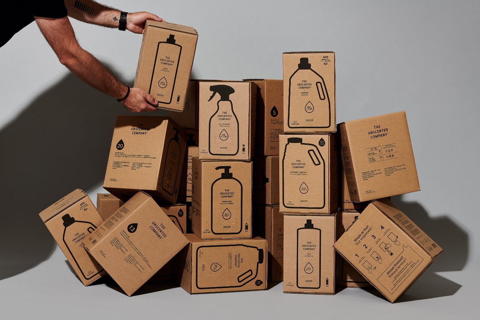 BANG. A variety of refillable products. BANG. New refill and expedition boxes. The objective was to make the main surface of their many refill boxes more appealing, and to add a pleasant touch to their daily expedition boxes. Due to a format change of the 4 L and the 10 L boxes, now glue-free, we were able to use contour lines on the main surfaces to represent the products. This decision allows using the filling pumps directly from a representation of the product on the front of the box, and it eases the identification and use of the refill stations, at home and in stores. As for expedition boxes, a bilingual description of each product, in English and in French, was applied on the boxed in their respective typographic weights. The 2 boxes for special shipments we