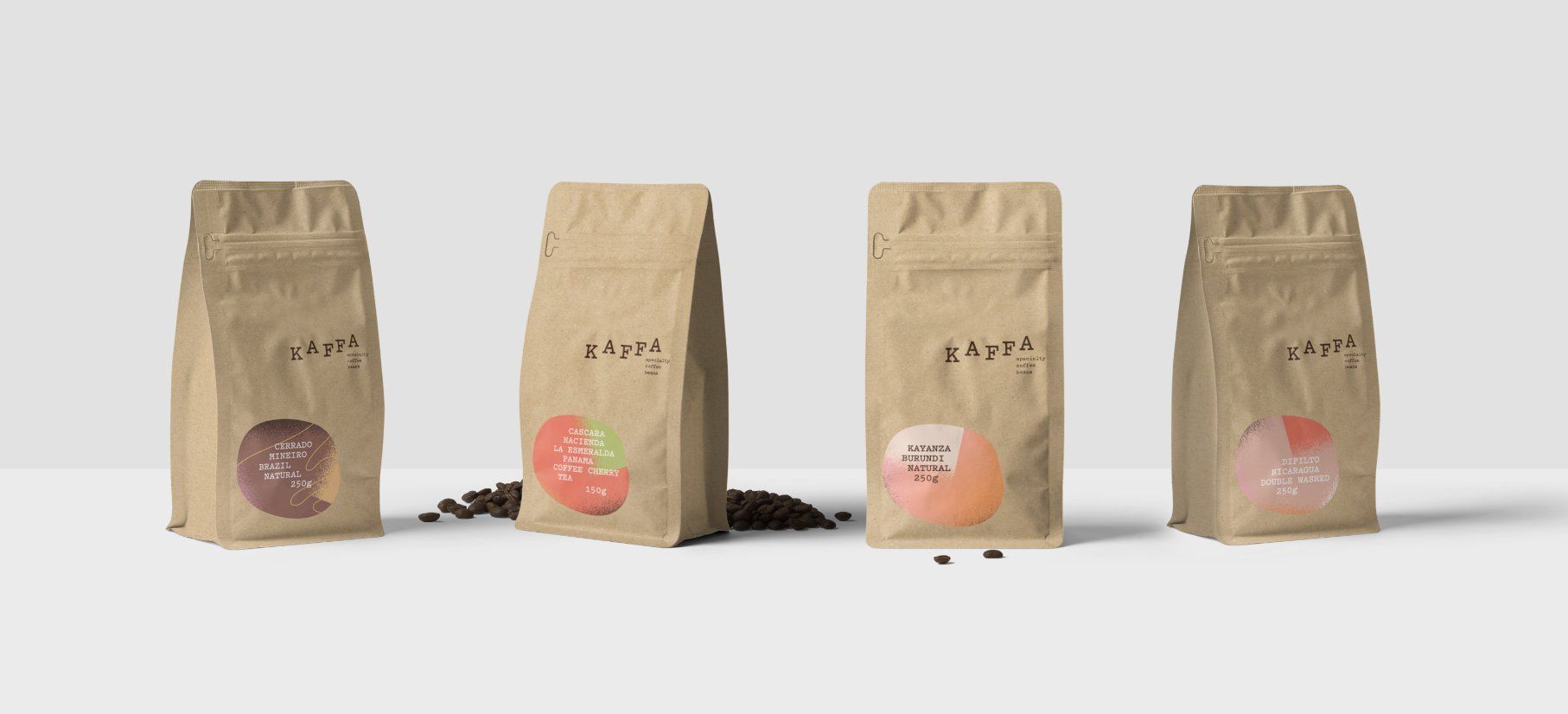 The brand design for Kaffa is straight-forward, yet fun enough to distinguish itself from the pack of other coffee roasters. The pastel-colored circles that adorn each bag features information about the roast in a visually inviting way. The capital, serif font is not aligned, bringing further playfulness to the brand. Each playful element is balanced with the brand’s straight-forward and sustainable brown package that contains the beans. Together, these elements create a unique and captivating coffee brand.