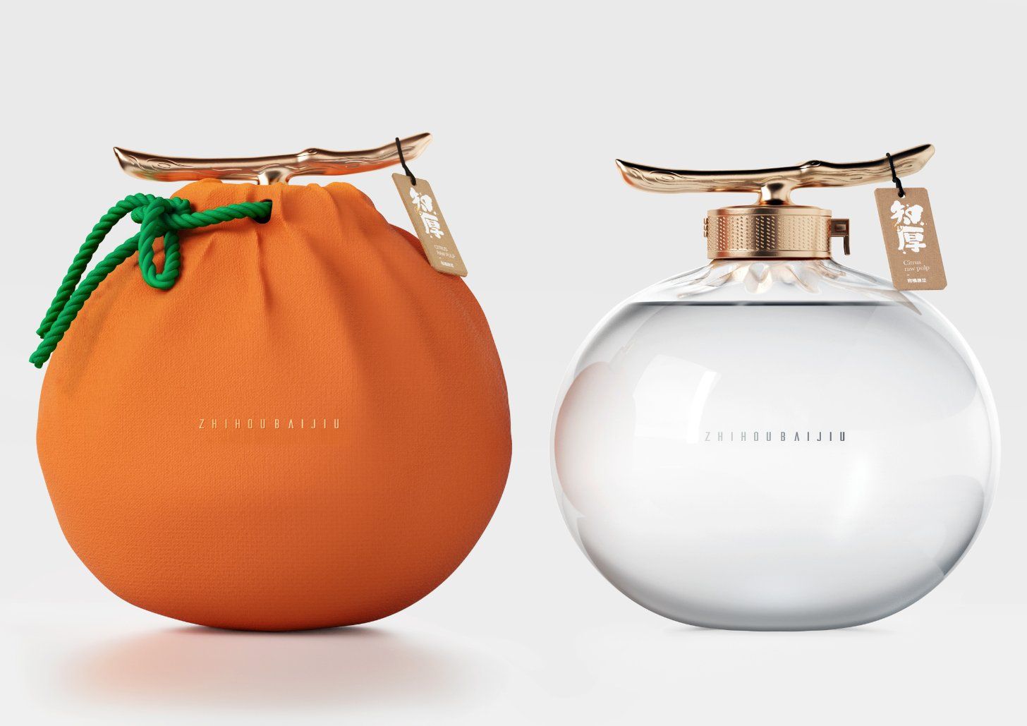 We designed the bottle into a ball shape, and made irregular bulges at the shoulders of the bottle, so that the shape would not look so monotonous. The shape of the bottle cap, we directly simulated the branches of citrus, when the bottle was put into the orange bag, the bottle cap would be exposed. It would look more like a real citrus, so that people would know the flavor of the Baijiu immediately, so as to achieve better communication effect.