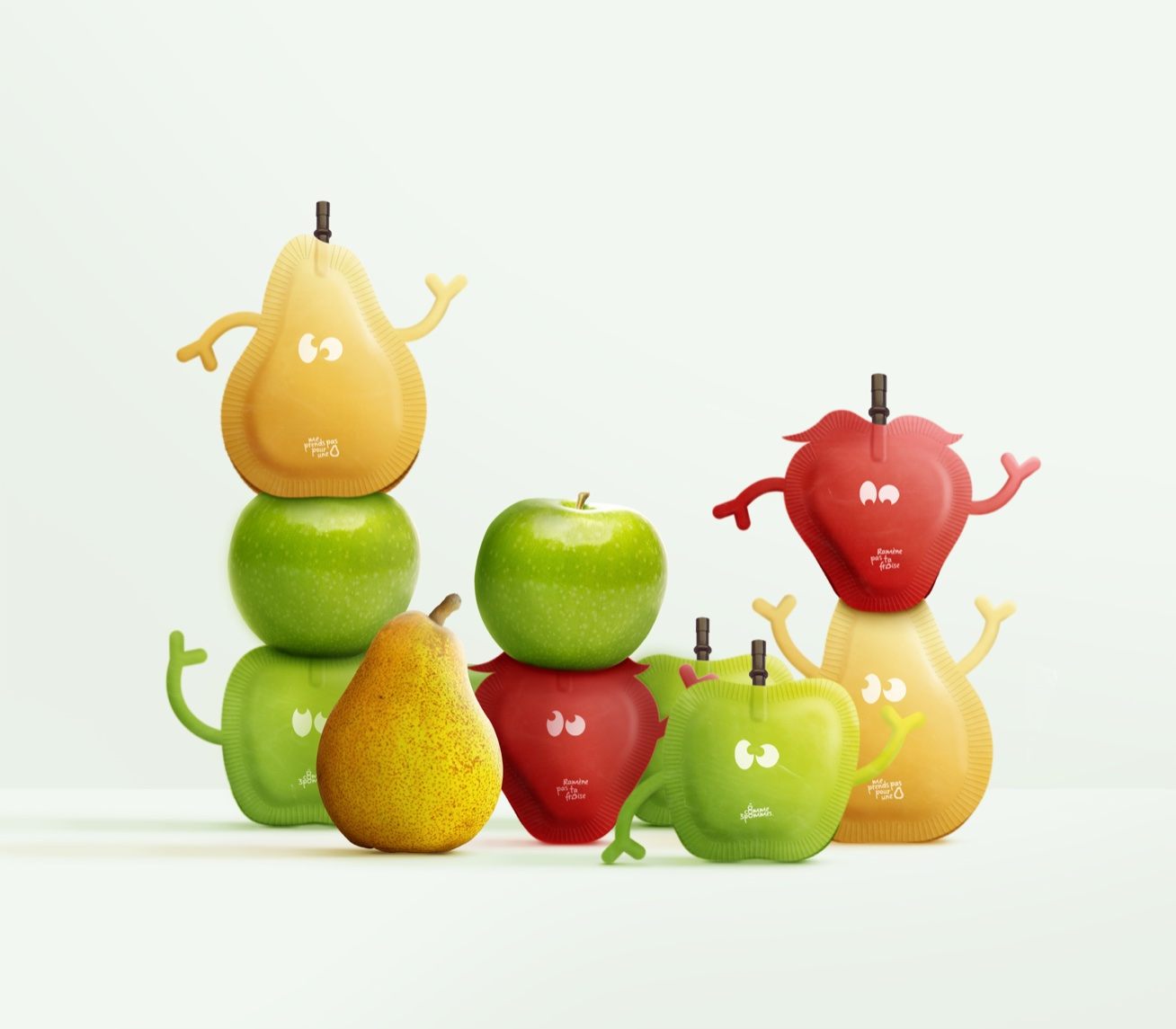 If you’re a parent or happen to find yourself around kids, you know that squeezable snack pouches are in. Following this trend in snacks, Mattéo Tabutieaux designed the packaging for snacks “Ô comme 3 pommes”, “ Ramène pas ta fraise“ and “Me prends pas pour une poire.”