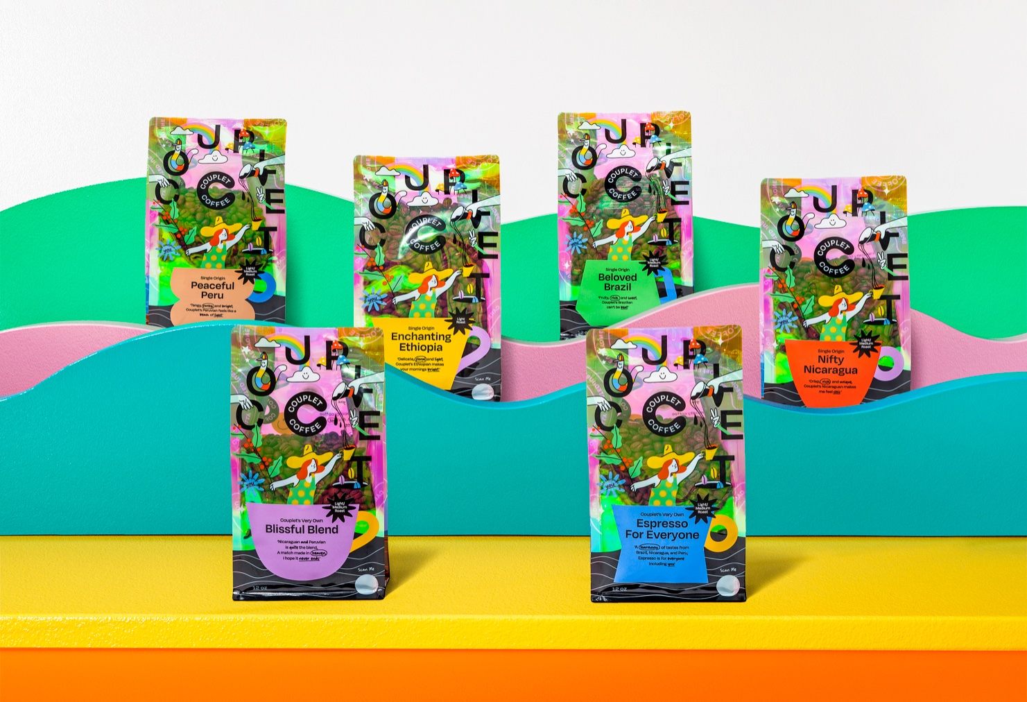 Javier Garcia designed Couplet Coffee’s packaging system with one thing in mind: spunk. As a result, the details, the color, and the gleam seen throughout the packaging system are more than uplifting; they’re genuinely buzz-worthy. Although the bags are overflowing with design elements and typography that’s anything but linear, it all converges into a design system that feels refreshingly exploratory.