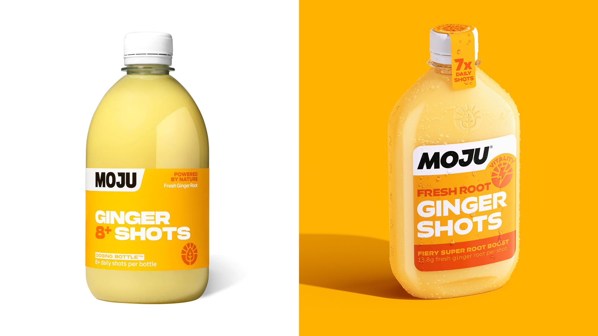 Ginger and Tumeric shots have an inherently bold taste, and Earthling Studio’s design for MOJU’s packaging system leans into this universal truth. Through entirely unafraid and oversized typography and bright yellow and red color palettes, the packaging system is dynamic and approachable but still representative of the vibrant flavors within.