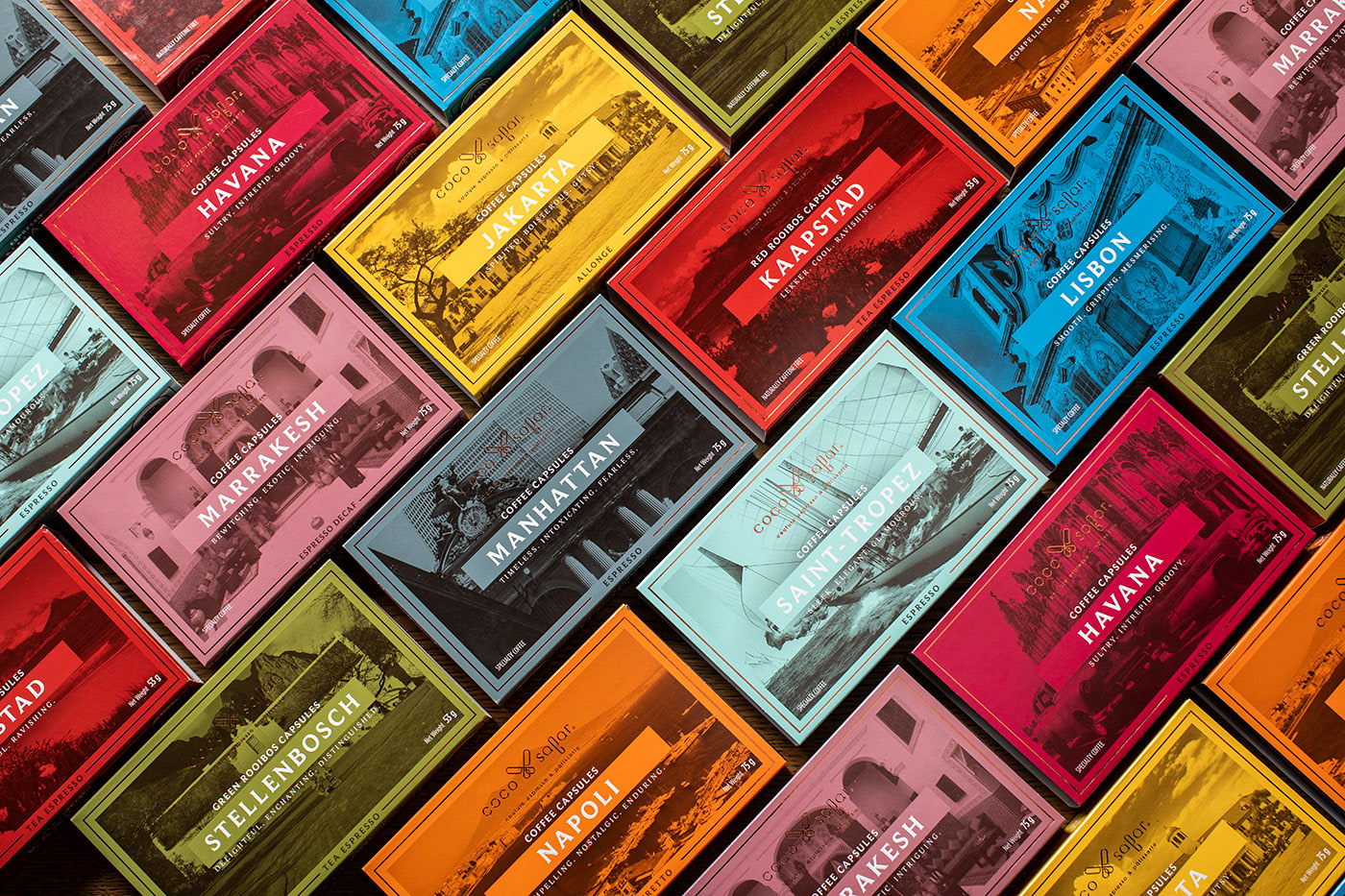 MARK Studio delivers a little history and a little class for Coco Safar’s new line of single coffees, The Couture Edition. Each box features a signature color, a landmark representing the origin of the coffee and clean, white font with accents of gold.