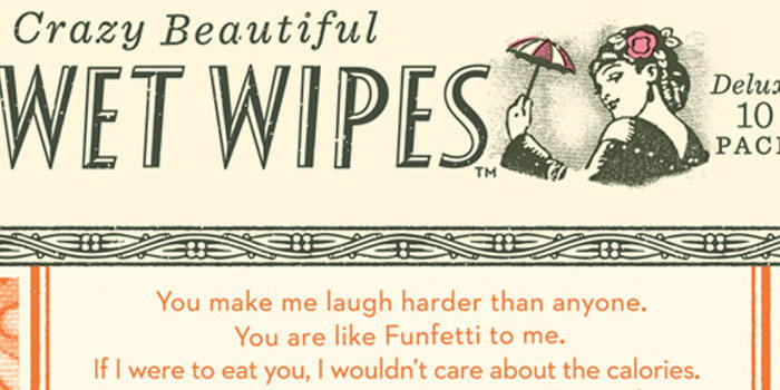 Crazy Beautiful Wet Wipes embodies the best friend characteristic, yes, the sarcastic, witty, slightly offensive, but comforting to have around best friend. Blue Q‘s range of wet wipes are as Beautiful and Crazy as the name suggests, with fun witty copy, beautiful fabric patterns, old illustrations and typography.