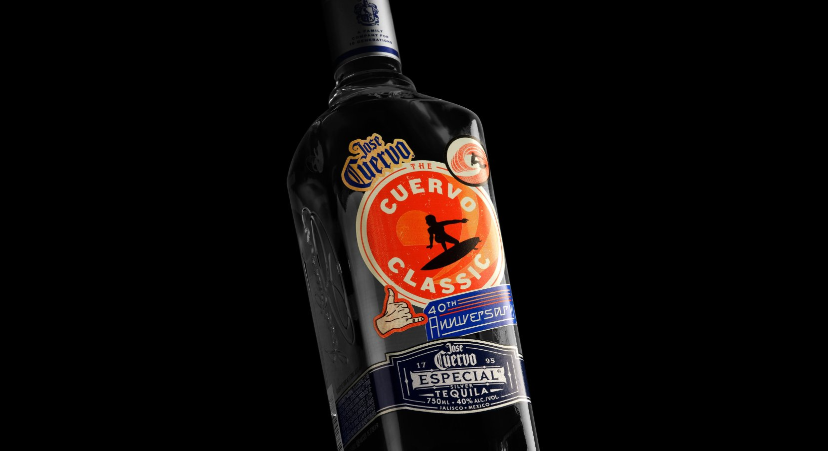 The label design for Cuervo Classic crafted in honor of the tequila brand’s 40th anniversary, is a throw back to the days where you and a group of friends would bring Jose Cuervo to the beach to catch some waves. The sticker-forward label features tropical-inspired surfer-competition stickers that give the overall feel for the bottle a retro beach dream.