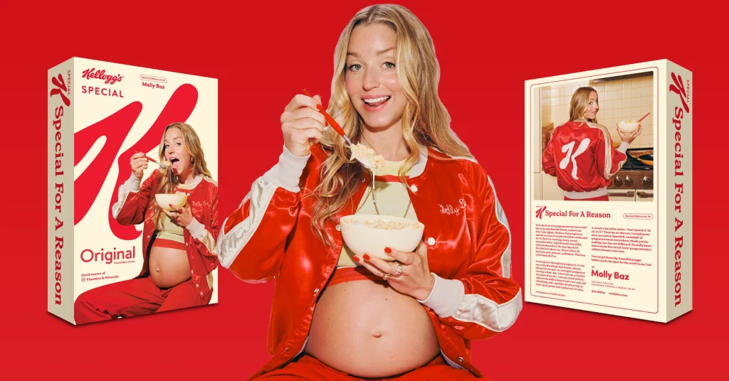 Until now, the showcase of womanhood and maternity has mostly been limited to magazine covers. WK Kellogg’s Special K is the first cereal to feature a famous pregnant person on the box, partnering with cookbook author Molly Baz.