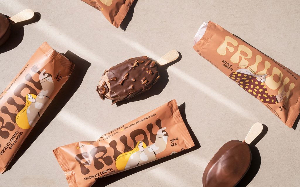 Kuudes designed a quirky packaging system for Friidu, a plant-based ice cream brand centered around vibrant terracotta tones that create a sense of warmth and indulgence. The packaging features eccentric illustrations that give each flavor a distinct personality, making the brand all the more approachable. Complementing the design, the thick, creamy typography reinforces the idea that plant-based ice cream can still deliver a rich, decadent experience.