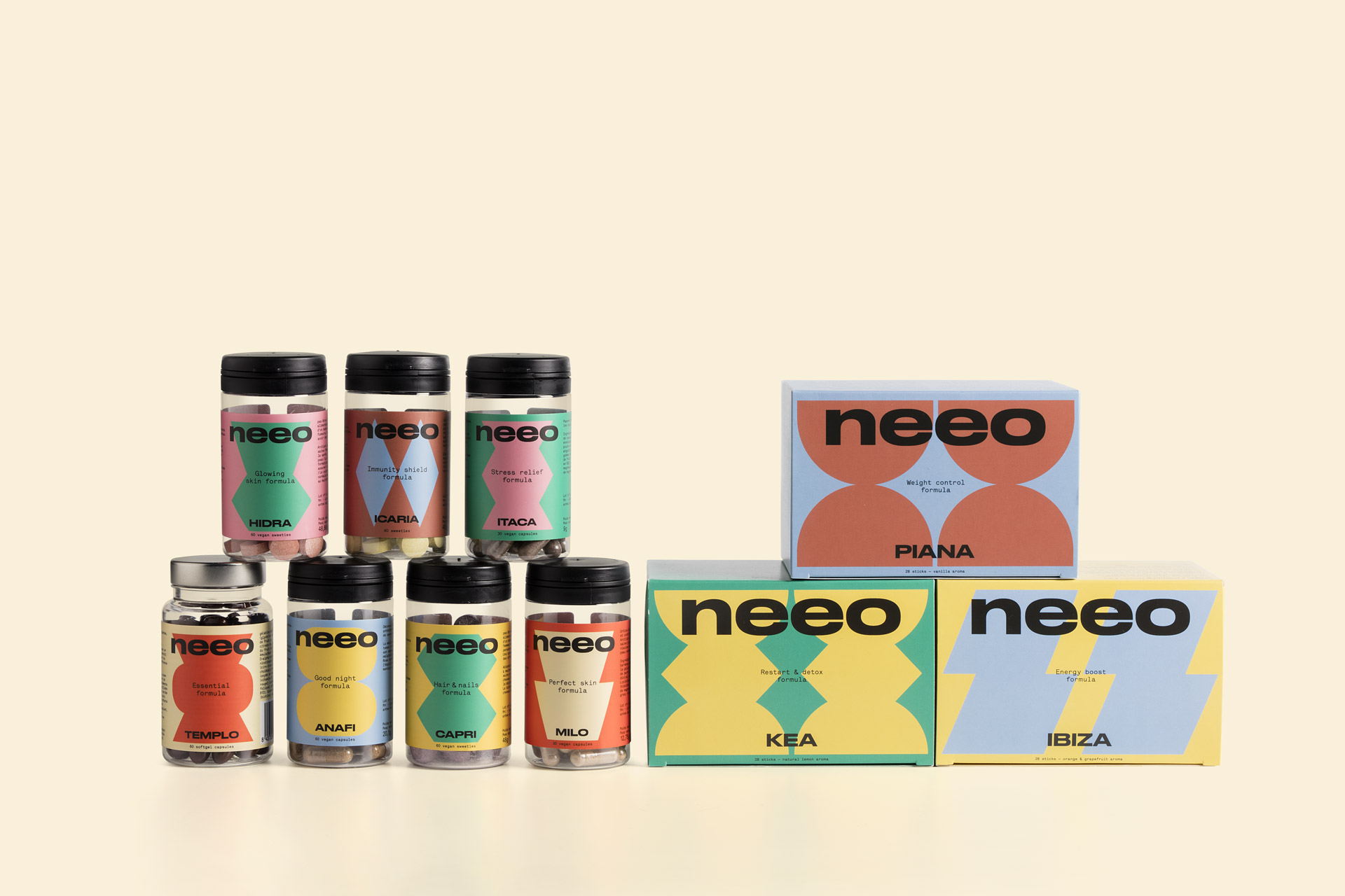 Neeo is a new line of supplements that derives its ingredients and ethos from the Mediterranean. Products are sourced and made in the Mediterranean region and are designed to improve skin, nails, immunity, sleep, detox, and energy. Branding and packaging design by Spain-based Studio Hey also taps into the visual richness of the Mediterranean in the branding and packaging design to convey the region’s spirit visually.