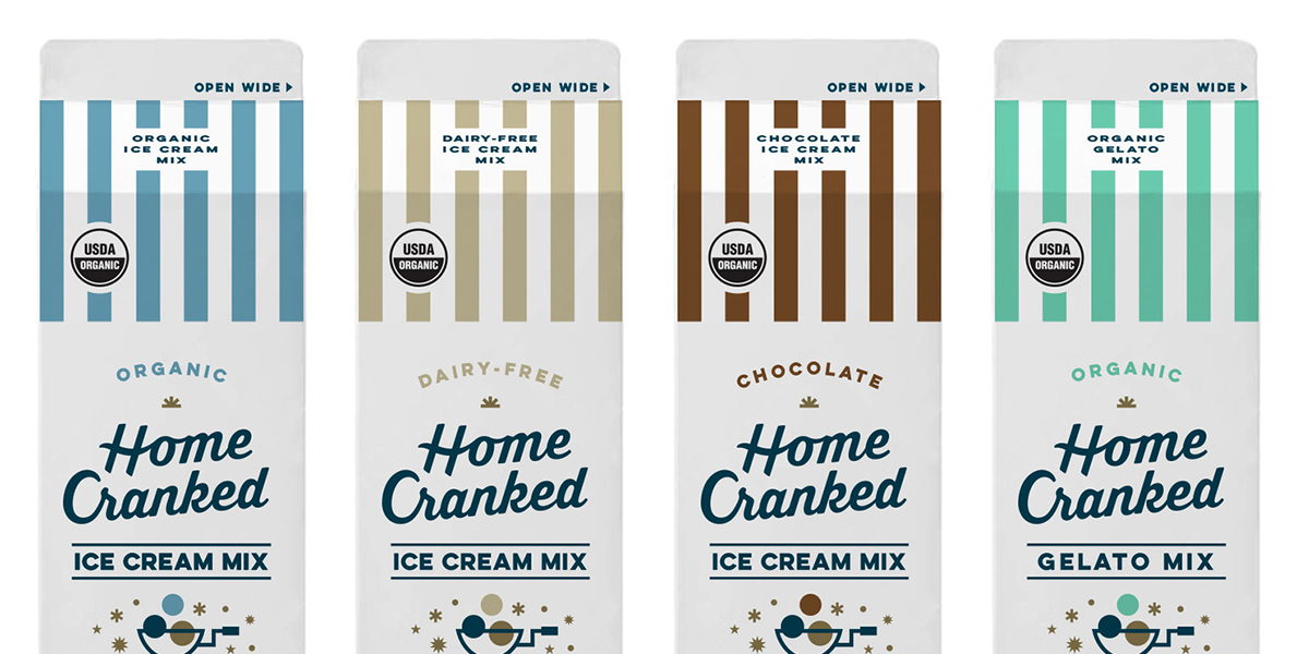 Did you ever make your own ice cream in science class by tossing around your ice cream ingredients in some plastic baggies with ice and salt? It was pretty cool, although it might not have been the most delicious ice cream you’ve ever eaten. Home Cranked combines the joy of making your own frozen treat with the high quality of what you’d expect in a gourmet ice cream shop. Bureau of Betterment and Owen Jones & Partners worked together to create the branding, packaging, and implementation for Home Cranked Ice Cream Mix.