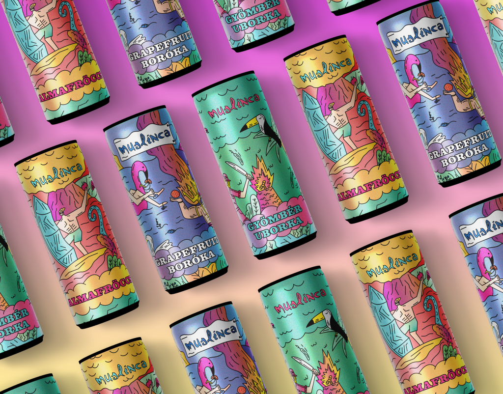 “Our packaging design brings Muslinca’s unique flavors to life through a series of eye-catching, whimsical illustrations. The product line features three exciting flavors: Apple Spritz, Cucumber-Ginger, and Grapefruit-Juniper. Each flavor is depicted through vibrant pop colors and imaginative scenarios, creating a visual narrative that highlights the unconventional and adventurous spirit of the brand.”