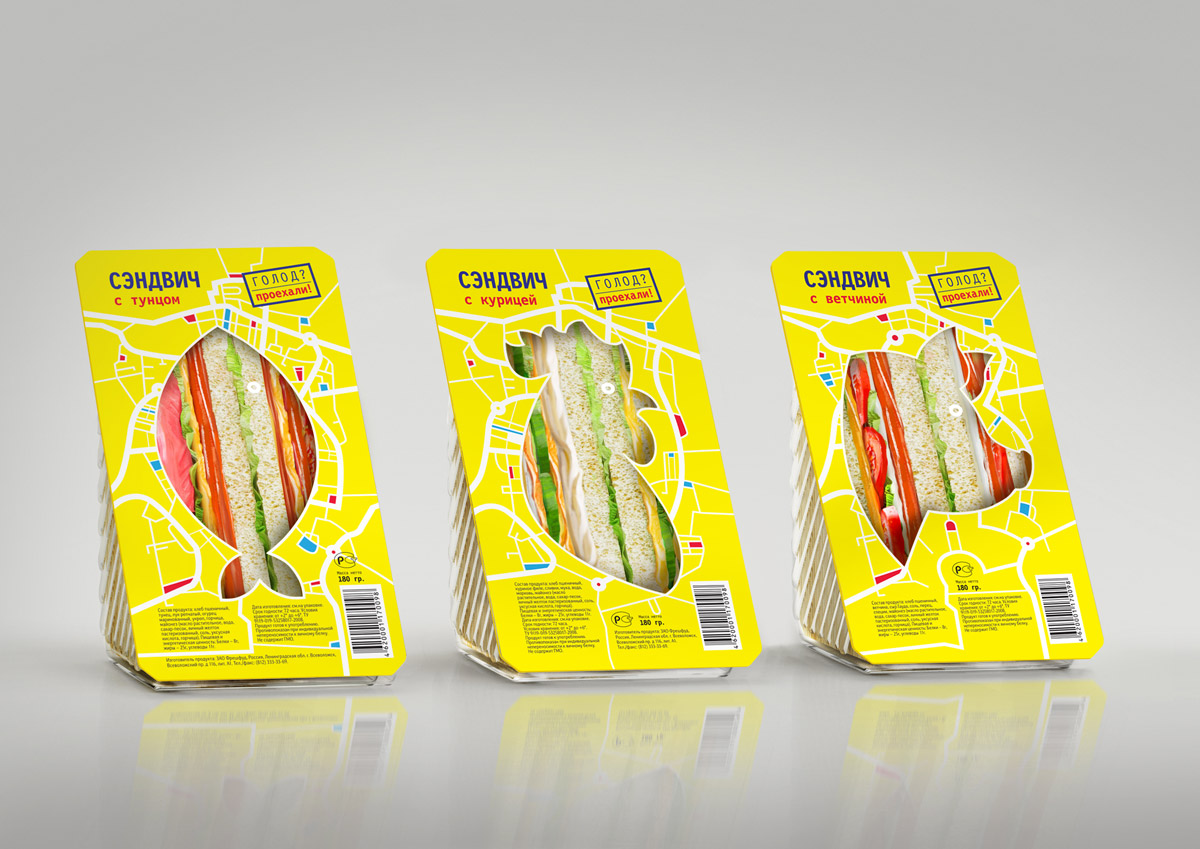 This on-the-go packaging for sandwiches was designed by Russian agency OTVETDESIGN. The packaging includes cut-outs denoting the variety meat per each sandwich, to include chicken, pork, and fish. The on-the-go concept is reinforced by the use of city maps on pack, always reminding the consumer to eat while being busy.