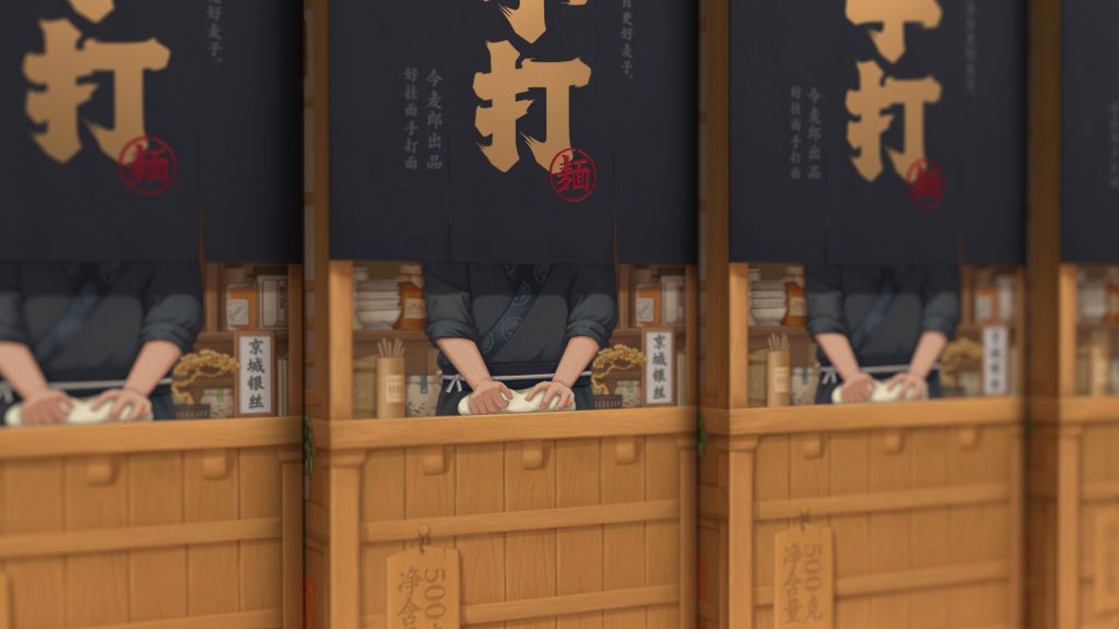 This is the packaging design of a series of noodles, named “Jinmailang Handmade Noodles”. The selling point of this kind of noodles is that it is comparable to the taste of handmade noodles. So we designed the packaging box to look like a ramen noodle house. People can see that behind the curtain there are chefs processing noodles, so that people can feel the strength of noodles and the freshness of ingredients at the first time.