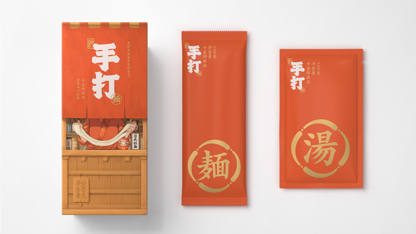 This is the packaging design of a series of noodles, named “Jinmailang Handmade Noodles”. The selling point of this kind of noodles is that it is comparable to the taste of handmade noodles. So we designed the packaging box to look like a ramen noodle house. People can see that behind the curtain there are chefs processing noodles, so that people can feel the strength of noodles and the freshness of ingredients at the first time.