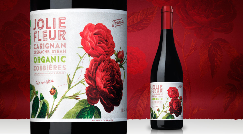“Jolie Fleur is a range of organic French wines inspired by the fragrance of the flowers that surround organic vineyards. The flowers serve several purposes: to attract pollinating insects such as bees and butterflies, but also to create biodiversity and act as a gauge for what insects are present in the vineyard.”
