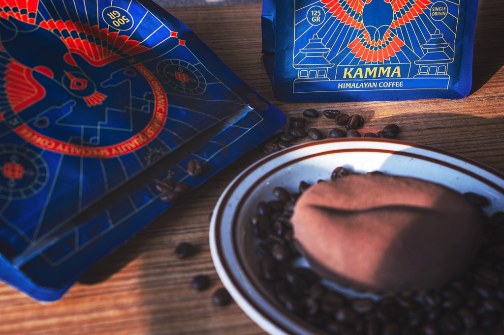 Kamma Himalayan Coffee’s packaging, designed by Lidenbrock Brand Consultants, features a deep cobalt base that sets the stage for an intricate line-illustrated crest, where a stylized bird spreads dramatically across the pack. The typography is sharp and architectural, highlighting the ornate illustration. Gold and red accents add contrast and hierarchy, making this bag of coffee truly feel like a daily ritual.