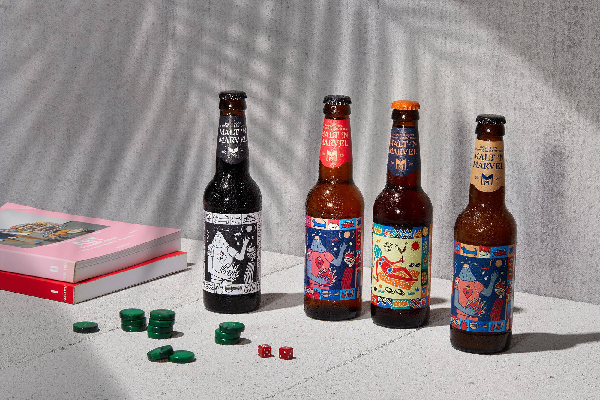 Naming, brand identity and packaging design for a Double IPA beer marvelly brewed by Ftelos Brewery, on the Greek island of Santorini. Malt ’n Marvel is mainly targeted at the local market, a market with a huge percentage of tourists from all over the world. This means an extremely broad audience and a non-existent brand loyalty. Based on these facts we wanted to create a product with a strong differentiation.