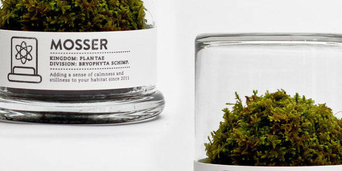 “The Mosser is a small glass terrarium filled with a simple round moss ball. The Mosser comes with a glass mister bottle used to feed your plant. They are very easy to care for and only need to be sprayed once every two weeks with filtered water.”