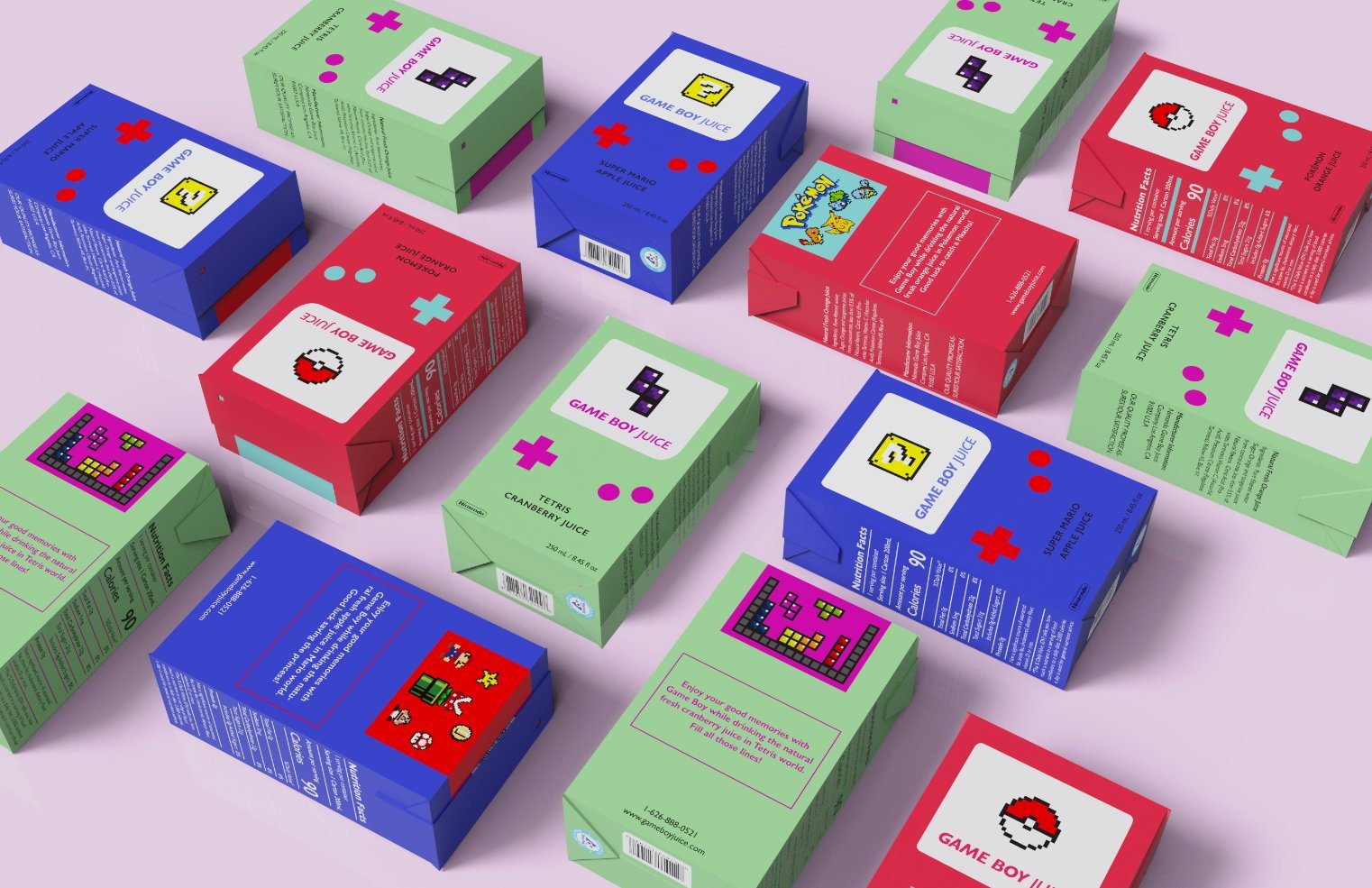 This hypothetical line of natural fruit juice box series from Nintendo uses the similar look of the Game Boy, and there are three different flavors based on three classical video games: Super Mario, Pokemon, and Tetris. Each of them will have a unique color palette and illustration at back.