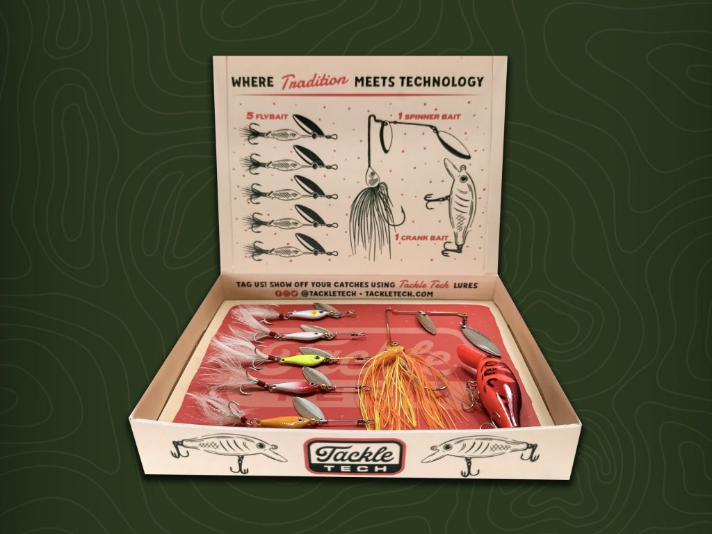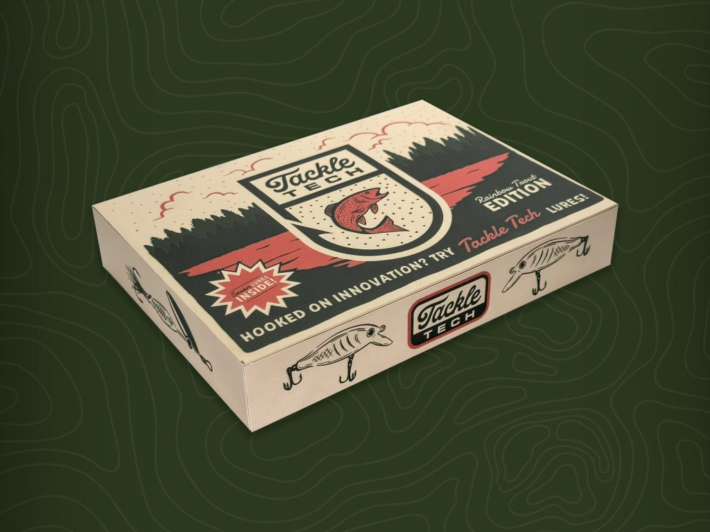 This project was created as an assignment for a packaging design course. The guidelines required me to find an item in the Dollar Store and reimagine the packaging so that it would be sold in a higher-end store. As I browsed the aisles of the dollar store, I came across the outdoors section and immediately gravitated toward fishing lures. As a novice fisherman, I felt that I could create a much more interesting and exciting brand, built around the lures. I was given the freedom to create the name, Tackle Tech, along with the brand identity. I wanted to have this redesign feel approachable but still intriguing to the modern fisherman. This specific box is the “Rainbow Trout Edition”, which is stated on the front of the box and pulls the color from the trout as well. I included illustrations on the back and front of the box as well as information about the brand and what Tackle Tech is all about. The back panel features a call to action for Tackle Tech users to send in pictures on social media of your latest catches. Inside the box, you will see the seven included lures along with a description of each one. In the end, I was able to produce a fishing lure kit that elevates the fishing experience by letting the technology of Tackle Tech do the heavy lifting for you.