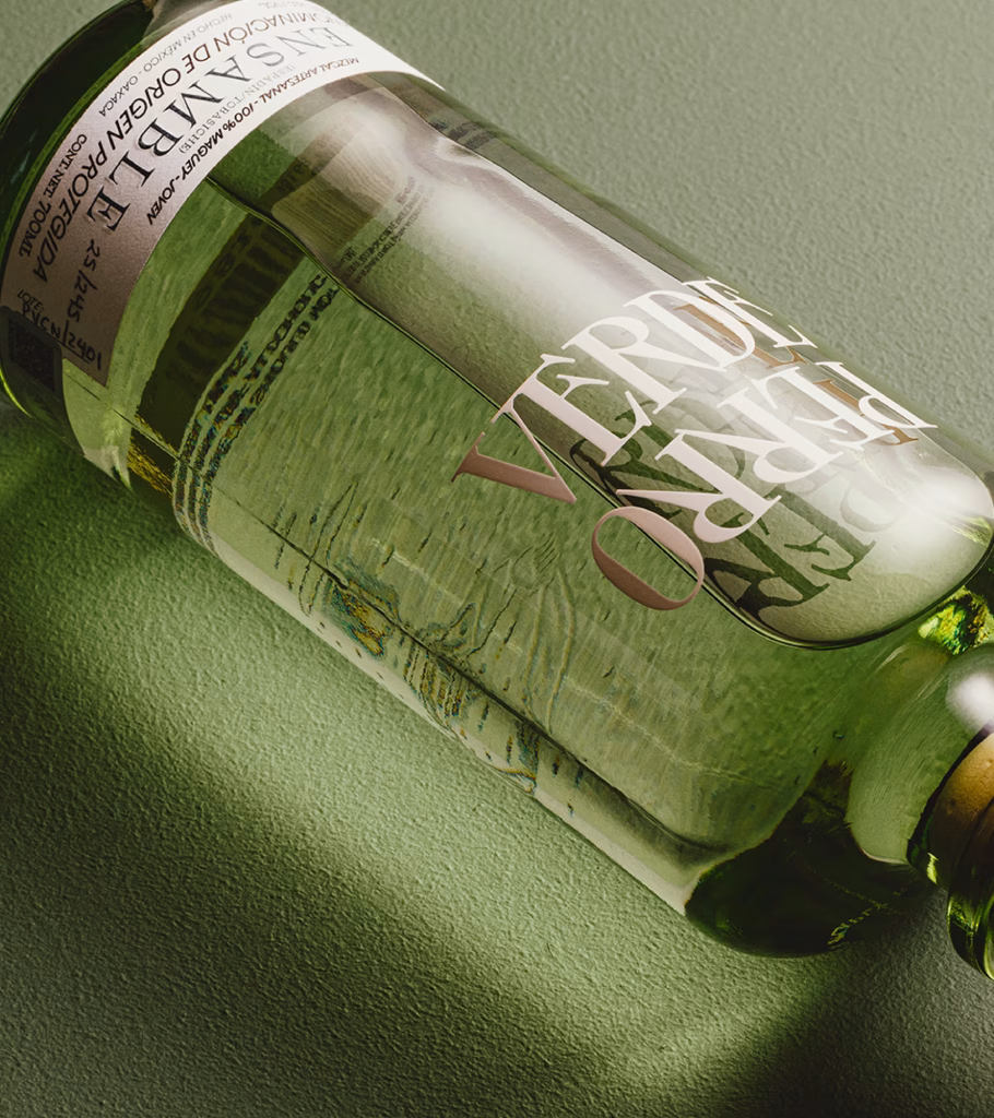 Perro Verde Mezcal’s packaging by S&Co leans into restraint. The tall green glass reads botanical and signals agave. The typography is authoritative, stacked in an inverted orientation, while subtle etched illustrations evoke woodcut maps and pre-modern printmaking, hinting at land and process without narrative overload.
