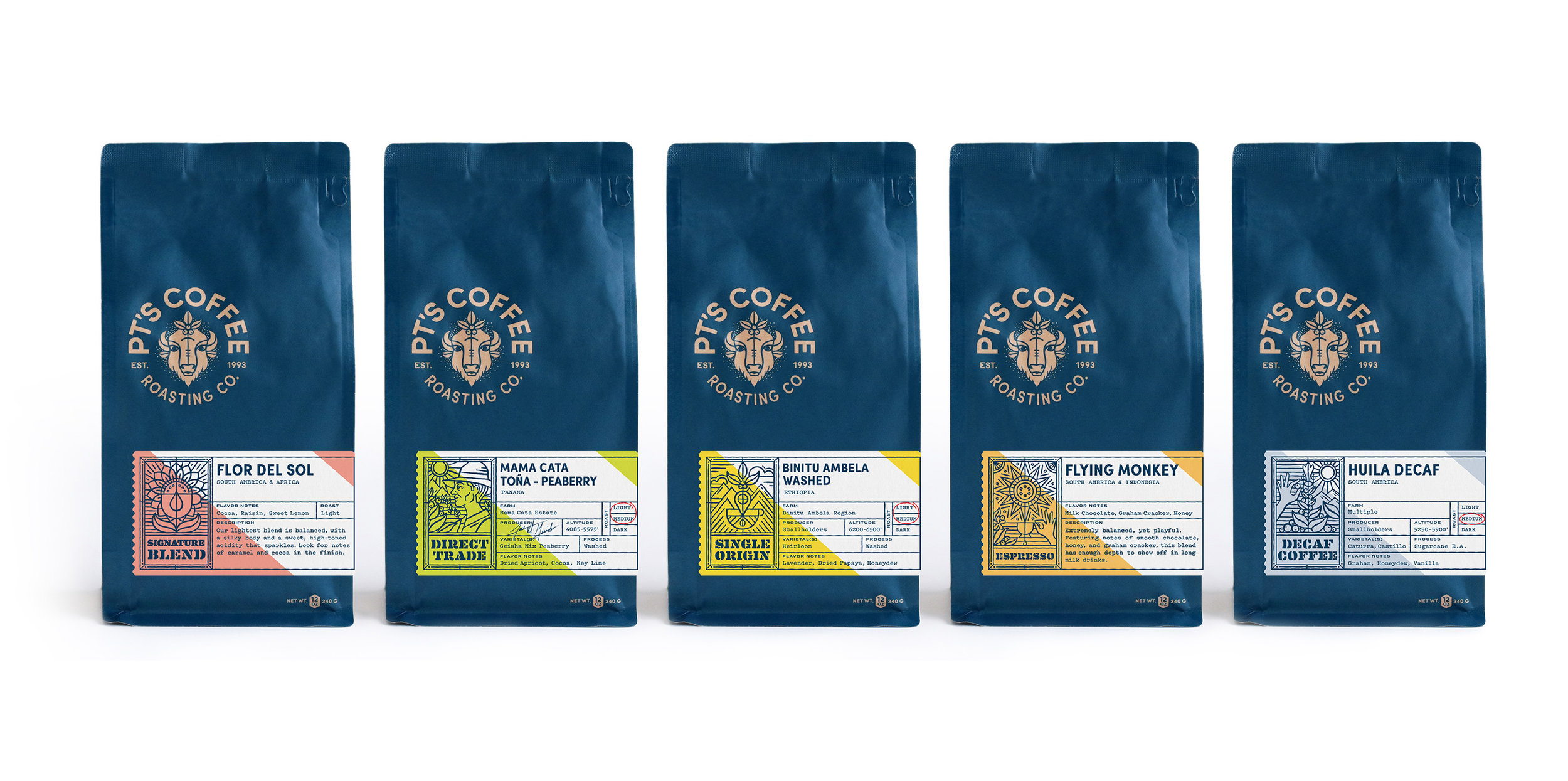 Carpenter Collective designed the strikingly blue coffee packaging for Kansas-based PT’s Coffee Roasting Company. The design provides the consumer with transparency as each bag provides information about the origin of the coffee in addition to the specific flavor notes that come with each blend.