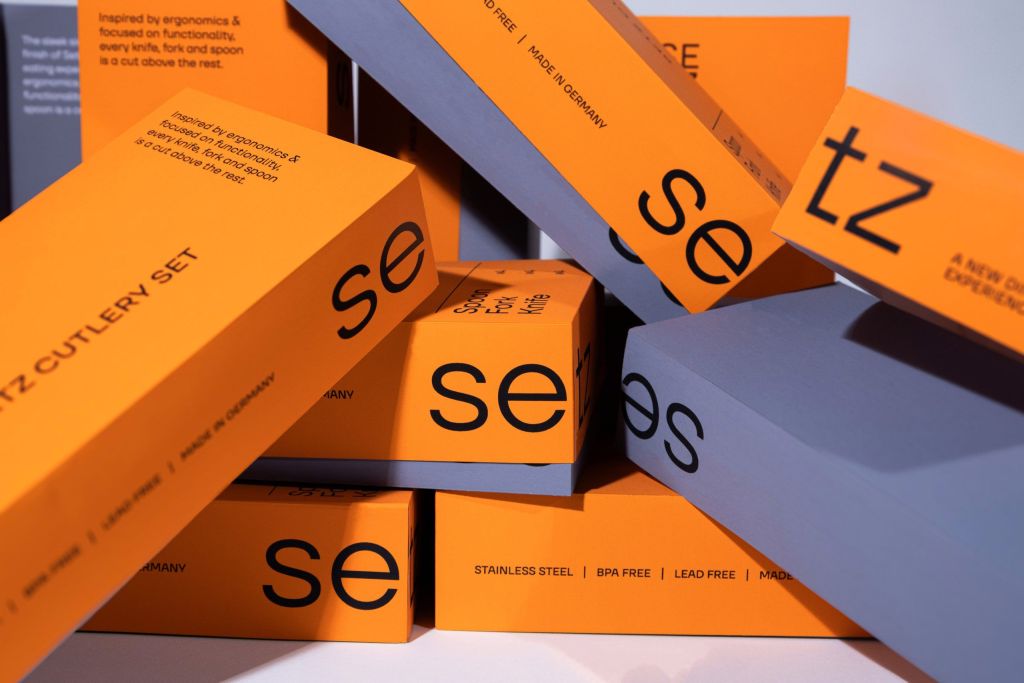 Gautami Upadhyay, a student from the Maryland Institute College of Art, created the Setz cutlery packaging concept. The design draws inspiration from the Bauhaus movement, with a striking orange hue and minimalist typography that emphasizes form and function.