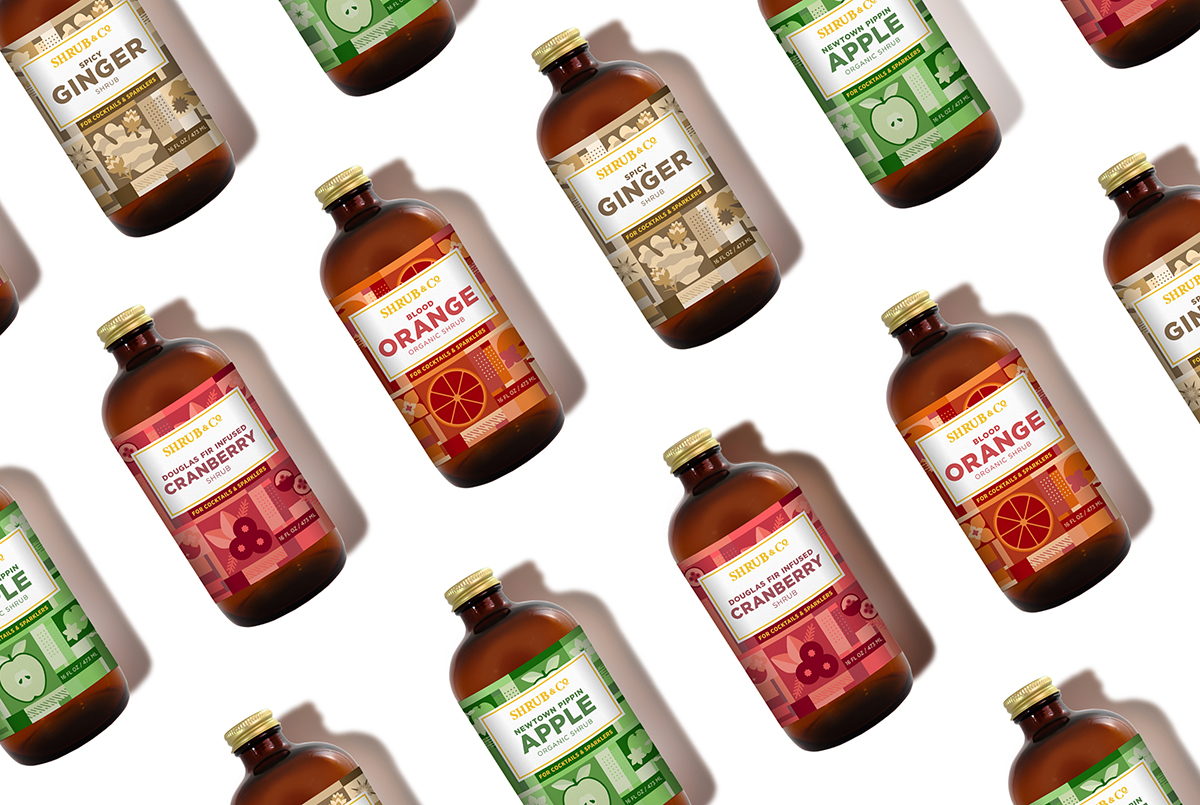 “The following product shots showcase label designs for a boutique company in Berkeley, CA. When approached by Shrub & Co to redesign their existing set of labels, we decided to start fresh and move away from their current look and feel. The concept was to create a flexible graphic system for all eight flavors. The systems has four sets of geometric illustrations that reflect that flavor. Each label has a color palette that uses three Pantone swatches, mixed ink add additional colors to the palette, and the final touch is gold foil stamping. The label system is versatile and can adapt to the addition of new flavors.”