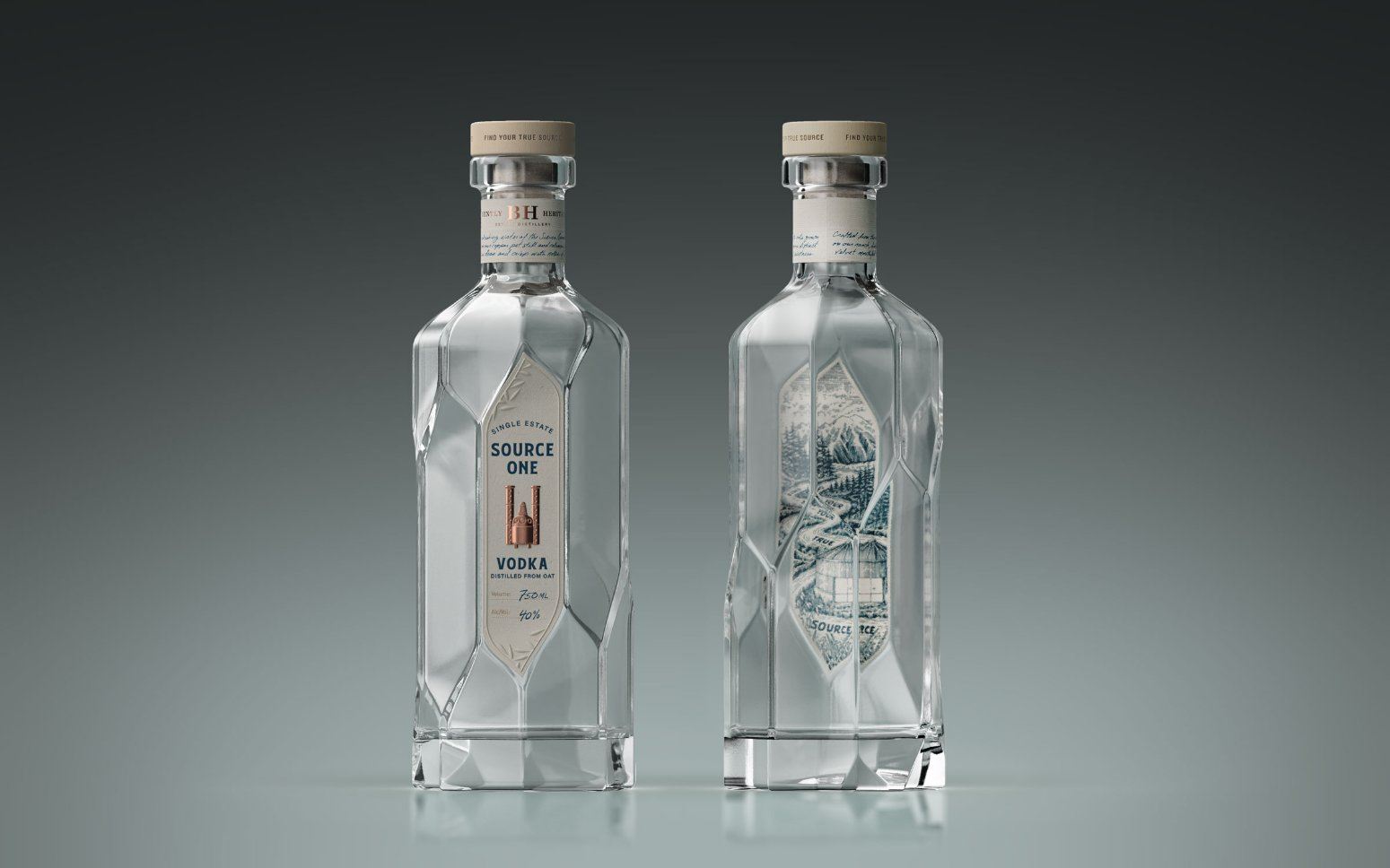 “Branding, packaging and structure design for Source One Vodka. A single-estate vodka distilled from Sierra snowmelt and oats that were grown on its own ranch in Minden, Nevada.”