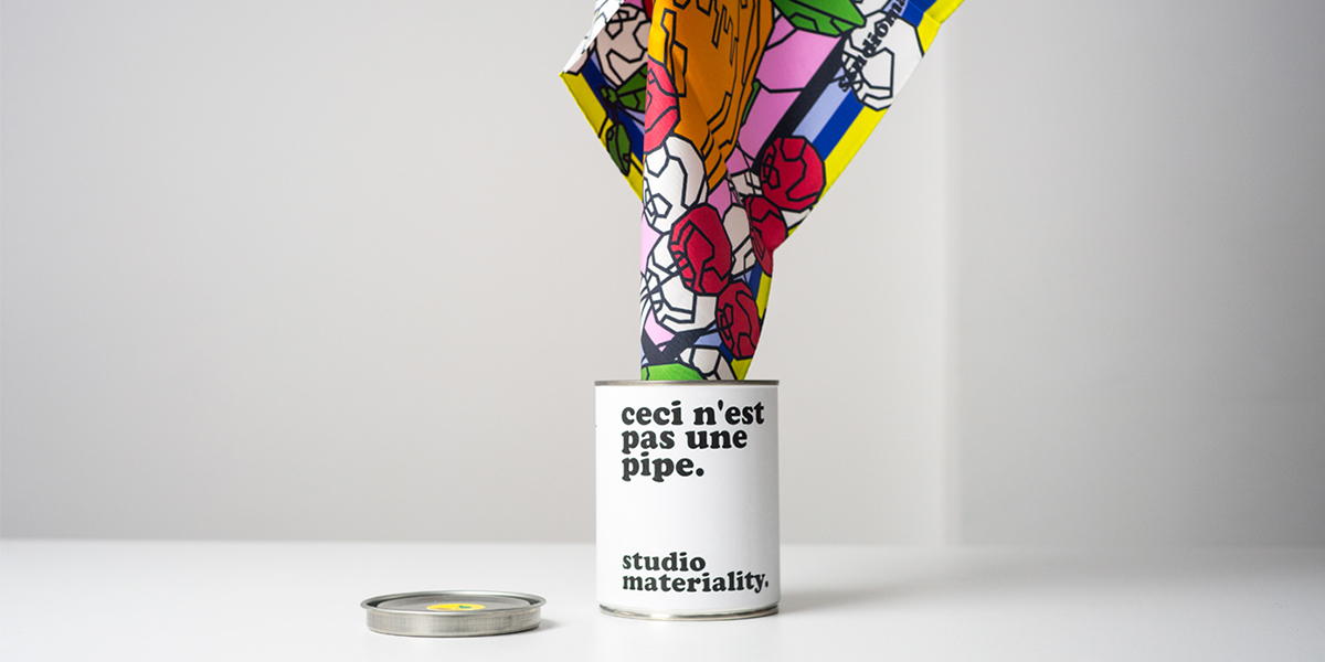 “Packaging design of silk scarves done for Studiomateriality. We alluded to the underlying concept of ‘The Treachery of Images’ by the surrealist René Magritte in a play with archetypical packaging formats. By using the tin, that is typically used for paint, to pack colorful 100% silk scarves we provoke the in the human mind existing hierarchies. Trying to make obvious that generally, we see things not as they are but as we think they are. Finally, we express with this design a concern of materiality and representation. Our reality is often more sign, image or symbol and we are mostly living in alienation of the real things.”
