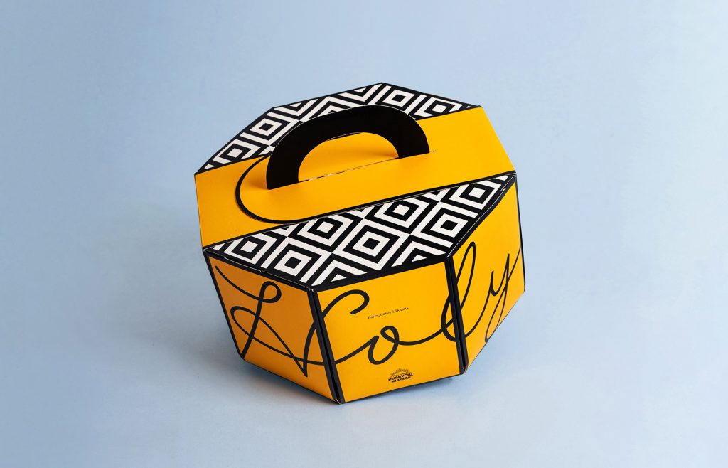 In the heart of Vilnius, Lithuania, Holy Donut grabs attention with its striking packaging, designed by Emilia Uzukauskiene. The boxes feature bold black-and-white geometric patterns and a vibrant sunshine yellow, enhancing visual appeal.